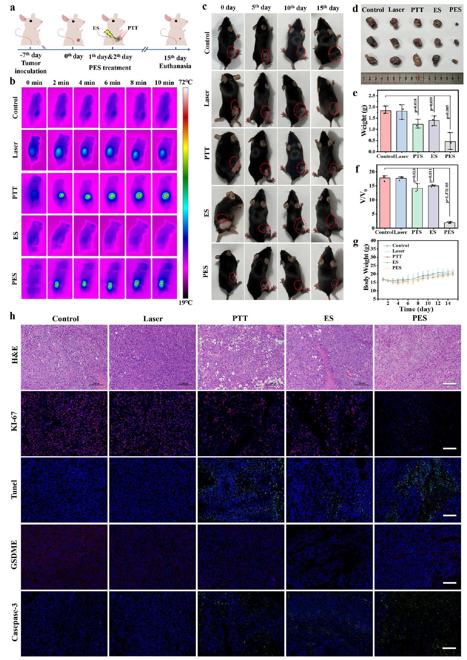 for tumor ablation can reach . Specially, the real-time infrared thermal images of tumor-bearing mice in the PTT and PES groups displayed a rapid increase of local temperature during the treatment process, which implies that the PTT and PES treatments are well suitable for tumor elimination (Fig. 5b). The thermal imaging of tumor and temperature profiles focused on tumor and the surrounded area (Supplementary Fig. 22) showed that the temperature of tumor surrounded area is about , which is less possible to damage the surrounding normal tissues during tumor treatment. The tumor sizes of mice after different treatments were recorded through optical photographs (Fig. 5c), which proved that significant suppression effect was enhanced under the PES treatment. The tumor tissues after the different treatments were dissected and weighed, and as shown in Fig. 5d, e, Supplementary Fig. 23 (The weights of mice body and tumors in different groups can be found at Supplementary Table 2), the eT-patch has a superior anti-tumor effect. The average suppression rate based on relative tumor volume was calculated to be , 14.13, 14.98, and 1.96, respectively, as shown in Fig. 5f (The absolute tumor volumes in different groups can be found at Supplementary Table 3). And the body weight of mice under different groups has no significant loss (Fig. 5g), demonstrating low systemic toxicity of the materials and method. To better evaluate the treatment efficacy, further hematoxylin and eosin (H&E) and Ki-67 staining were performed, and the results of which showed that PES therapy with eT-patch has the most significant tumor damage and proliferation inhibition (Fig. 5h). To further check the damage degree of the tumor after PES treatment, the bio-TEM images were conducted to observe morphology of cells from tumor site. As shown in Supplementary Fig. 24, the organelles of mitochondria were seriously destroyed after PES, compared with control group. Moreover, TUNEL immunofluorescence images of tumor tissues revealed that the PTT and PES therapies of eT-patch obtained the highest level of cancer cell apoptosis. Note that caspase-3 as a pyroptosis marker can be activated to cut GSDME protein to trigger cell pyroptosis , as shown in Fig. 5h, the GSDME protein expression level was significantly reduced in the ES and PES groups because more caspase-3 were activated after the ES to cut GSDME. Clearly, both cell apoptosis and pyroptosis were triggered under the PES treatment of the eT-patch, both of which will benefit to the antitumor efficacy of the method. Attractively, the survival rate of tumorbearing mice was greatly improved after the PES treatment (Supplementary Fig. 25). The metastasis of tumor after the treatment was also evaluated through H&E imaging. As shown in Supplementary Fig. 26, no nodules were observed in lungs of mice of all groups, indicating that the treatment had no promoting effect on the metastasis of cancer.