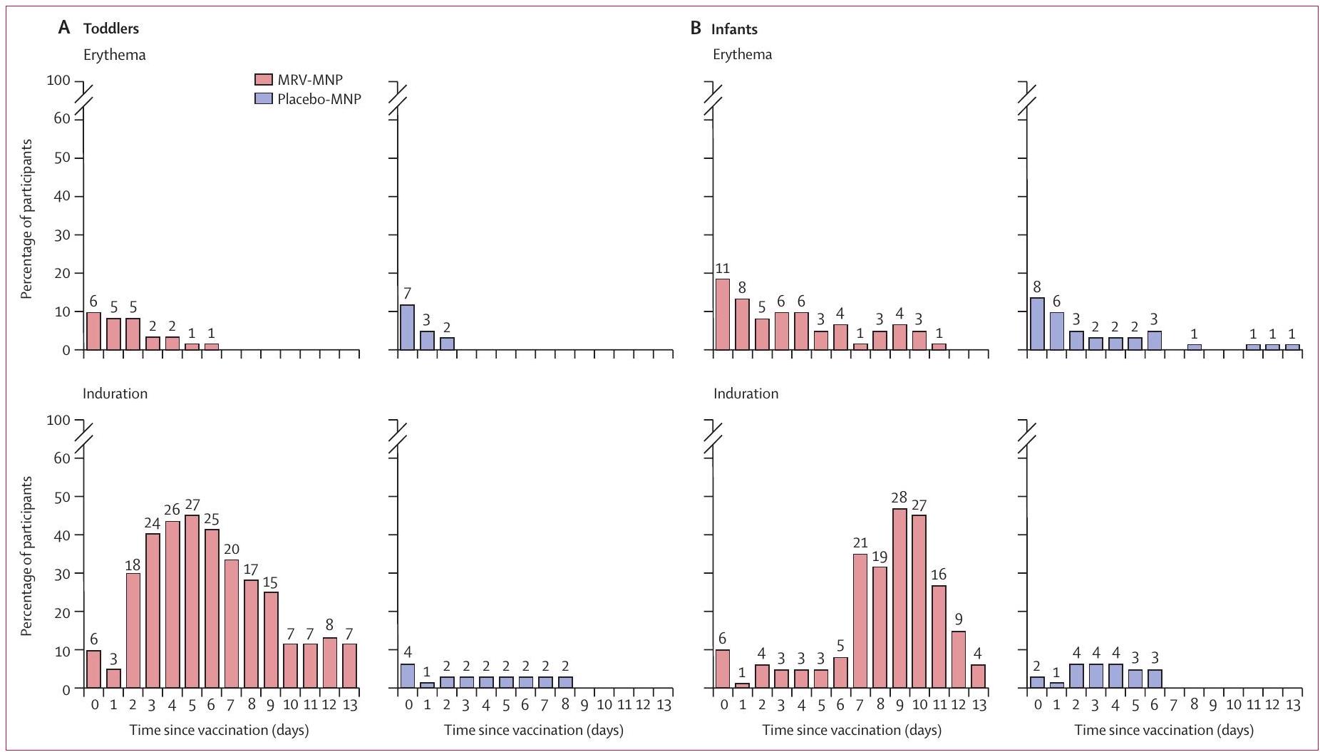 Given the delivery of the vaccine viruses directly into the skin, mild local reactions at the MRV-MNP application site were more frequent than at the subcutaneous injection site. Induration was the most common local solicited event in toddlers and infants. The earlier peak in incidence in the toddlers (day 5) compared with the infants (day 9 ) suggests an anamnestic