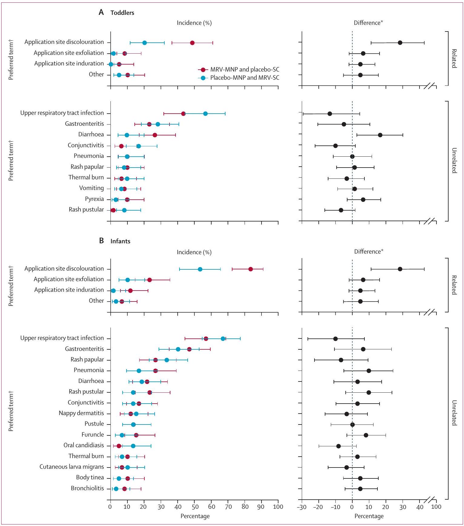 لقاحات الحصبة والحصبة الألمانية. في البالغين، كانت لقاحات الحصبة والحصبة الألمانية التي تم إعطاؤها للأطفال الذين تتراوح أعمارهم بين 15-18 شهرًا، والرضع الذين تتراوح أعمارهم بين 9-10 أشهر، مقبولة جيدًا وآمنة. كانت التورمات في موقع التطبيق شائعة، حيث حدثت في ما يقرب من نصف جميع الأطفال والرضع، لكنها كانت خفيفة في جميع الحالات وحلّت دون علاج. لم تكن أي من ردود الفعل المحلية مصدر قلق من الناحية الأمنية. كما كانت تغيرات اللون في موقع التطبيق، التي كانت تقريبًا حصريًا فرط تصبغ، شائعة أيضًا، حيث حدثت في ما يقرب من 50% من الأطفال.