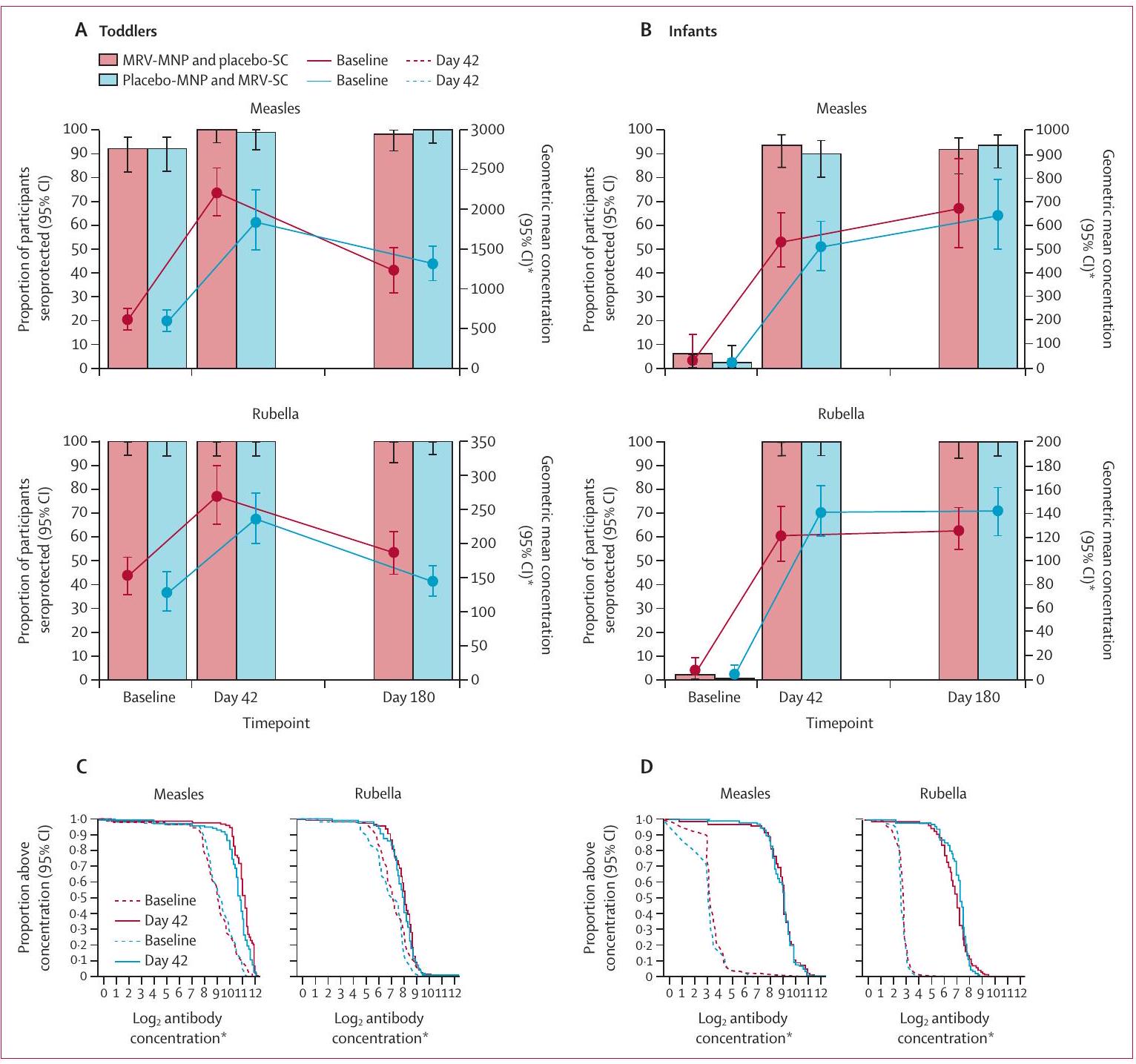 تم تقييم نتائج المناعية باستخدام كل من الأجسام المضادة SNA والأجسام المضادة IgG للحصبة والحصبة الألمانية، وكانت معدلات التحول المصلية (نسبة المشاركين الذين كانوا سلبية المصل في البداية وأصبحوا إيجابيين في اليوم 42)؛ ومعدلات الزيادة الرباعية في الأجسام المضادة (نسبة المشاركين الذين كانوا إيجابيين في المصل في…