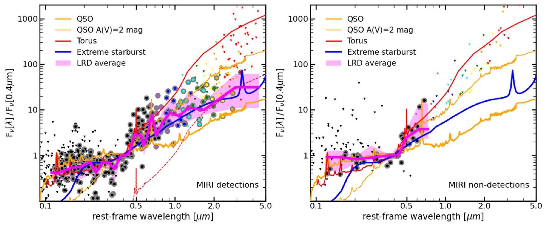 يتطلب حل التحديات الموضحة أعلاه التعمق أكثر في الأشعة تحت الحمراء المتوسطة (MIR) حيث يمكن تمييز انبعاث النجوم وAGN. بيانات MIRI عند الأطوال الموجية المرصودة الأقصر منتم تقديم عدد قليل من LRDs في أكينز وآخرون (2023)، بارو وآخرون (2024، أيضًا مع اكتشاف F1000W)، مما يشير إلى أنها قد تكون إما انفجارات نجمية غبارية (انظر أيضًا روديجيرو وآخرون 2023) أو AGN محجوبة، ولكن لم يكن بالإمكان الوصول إلى استنتاجات نهائية فقط من خلال أطياف MIRI الأكثر زُرقة. استخدم ويليامز وآخرون (2023a) بيانات MIRI ذات الطول الموجي الأطول من برنامج المسح الشامل للأشعة تحت الحمراء المتوسطة (SMILES) ووجدوا أن الأطياف المتوسطة (المكدسة في الأطياف المرصودة) لـ LRDs قد تساوت بعدتفسير هذا السلوك على أنه معدل الدوران المتوقع لطيف الإشعاع النجمي العادي في حالة السكون. بالإضافة إلى ذلك، وبخلاف تفسير AGN لبيانات ALMA الخاصة بـ LRDs في مجال A2744 التي قدمها لابي وآخرون (2023a)، وجد ويليامز وآخرون (2023a) أن الملاحظات الأعمق لـ ALMA لـ LRDs في GOODS-S يمكن أن تتفق مع نماذج SED التي تهيمن عليها النجوم في الغالب (مع بعض الآثار على شكل SED لانبعاث الغبار العالمي).