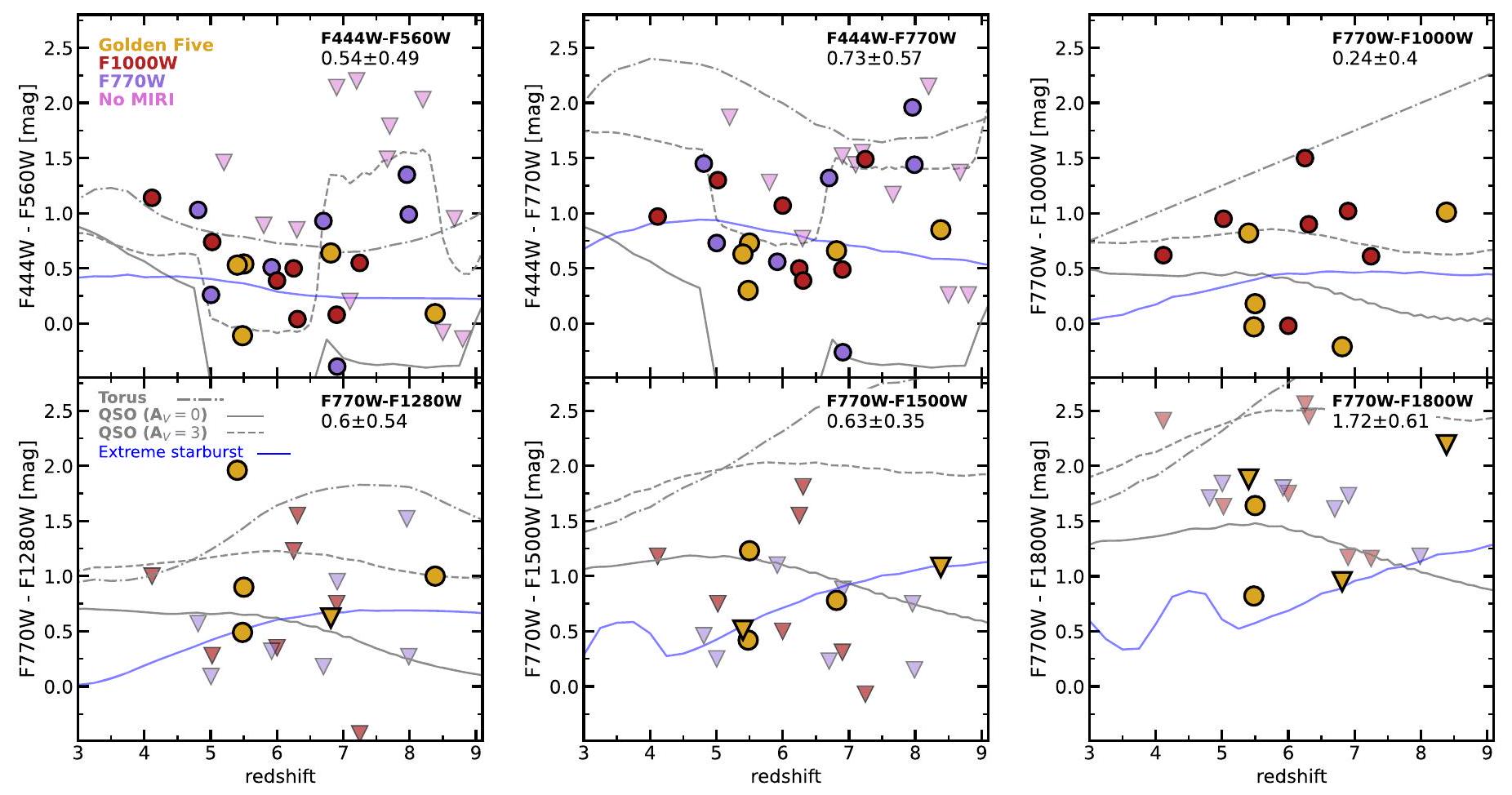 The F770W sample shown in Figure 17 presents more heterogeneous SEDs than the Golden Five or F1000W samples discussed in Section 4. The global slope of the SED is more constant, with the difference between the SW and LW bands being less marked than for the other LRDs. In fact, this sample includes a very blue galaxy ( ), which only entered the sample because of the enhanced F444W flux due to an emission line. The SEDs, including MIRI upper limits (remarkably, for F1000W and F1280W), are very flat in the range, completely compatible with being dominated by stars without the need of much more contribution from other emitting components. Compared to other subsamples, the F770W sources are more extincted (nearly 3 mag on average for the stars dominating the mass) and present older massweighted ages (nearly 10 Myr , compared to the for galaxies detected at longer MIRI wavelengths).