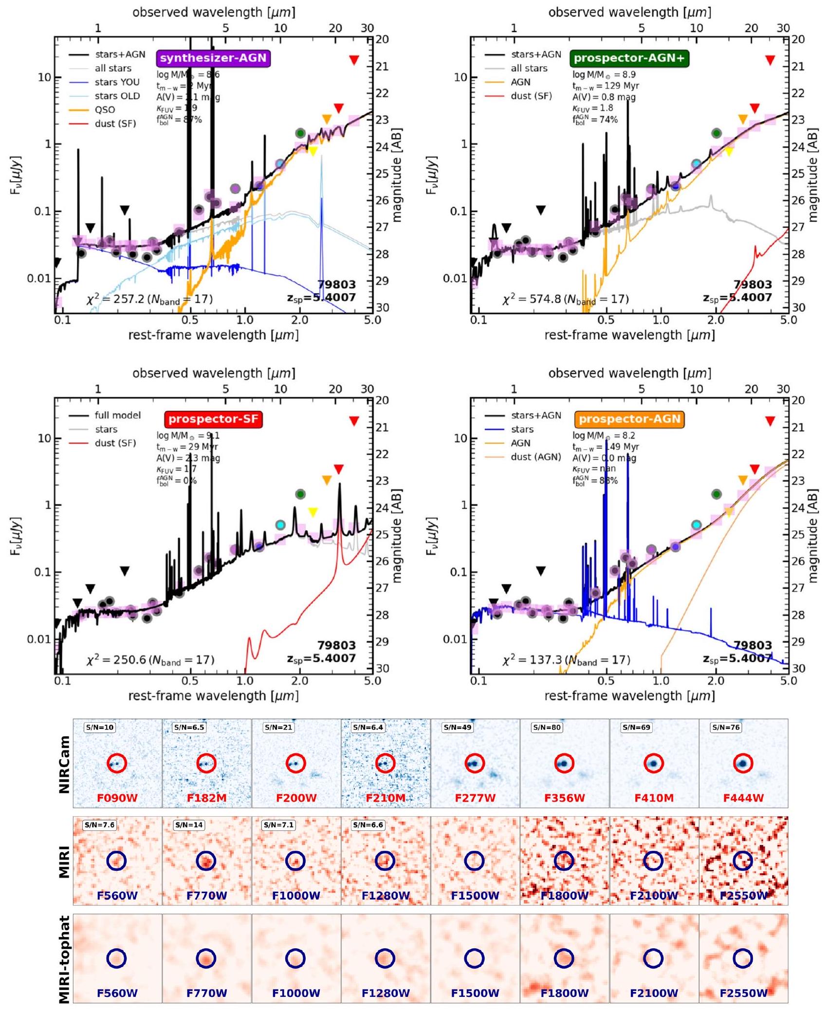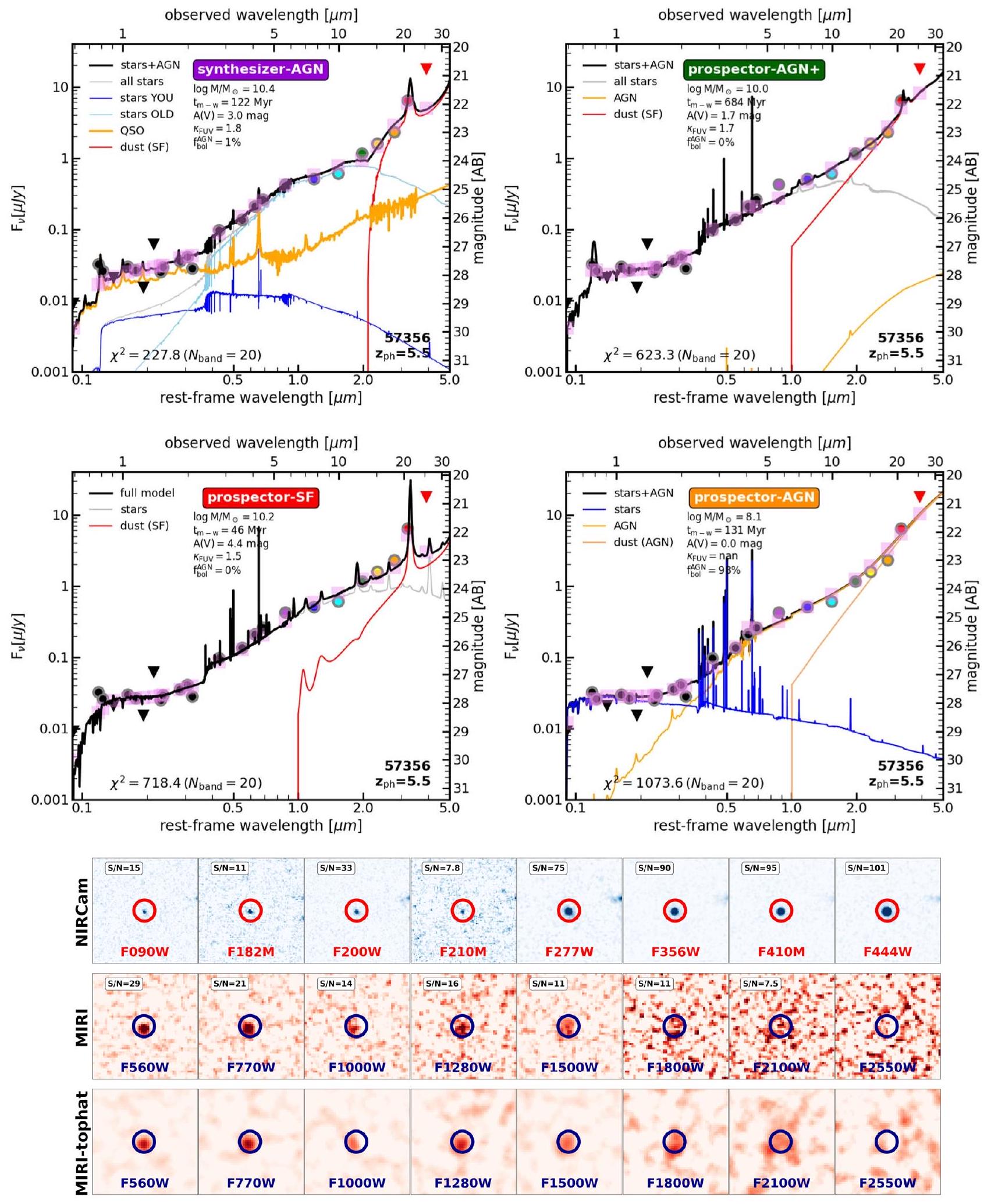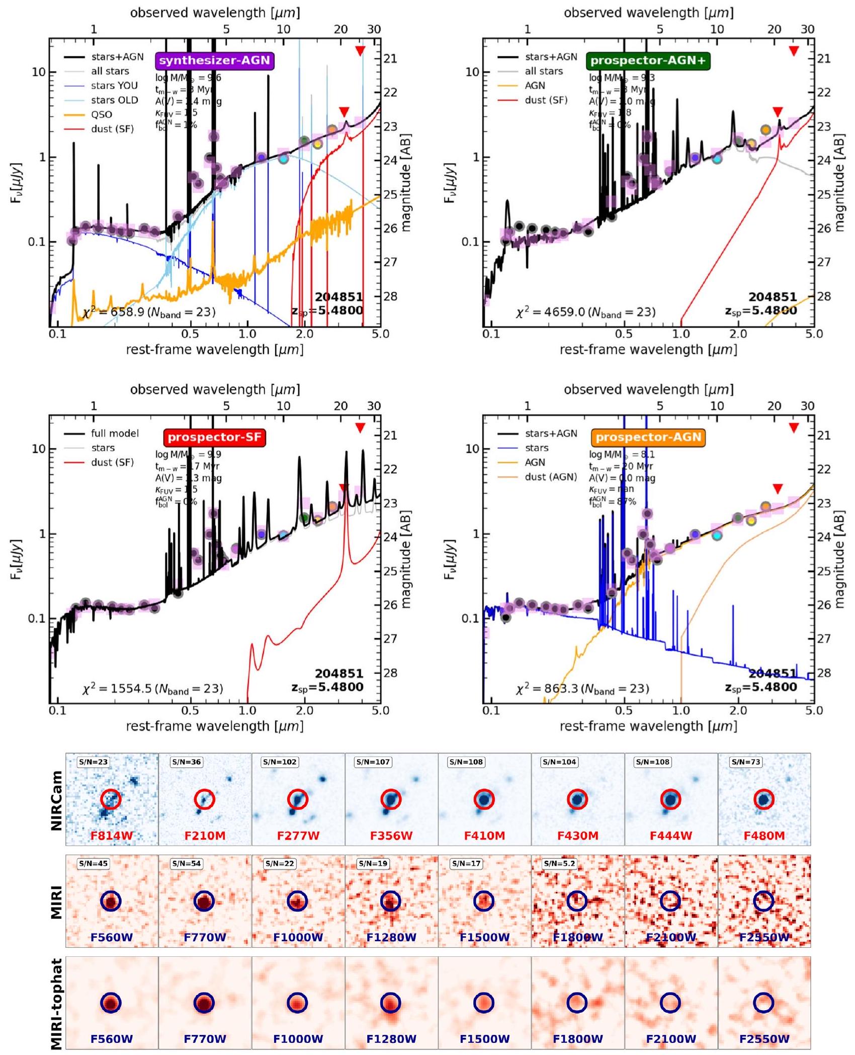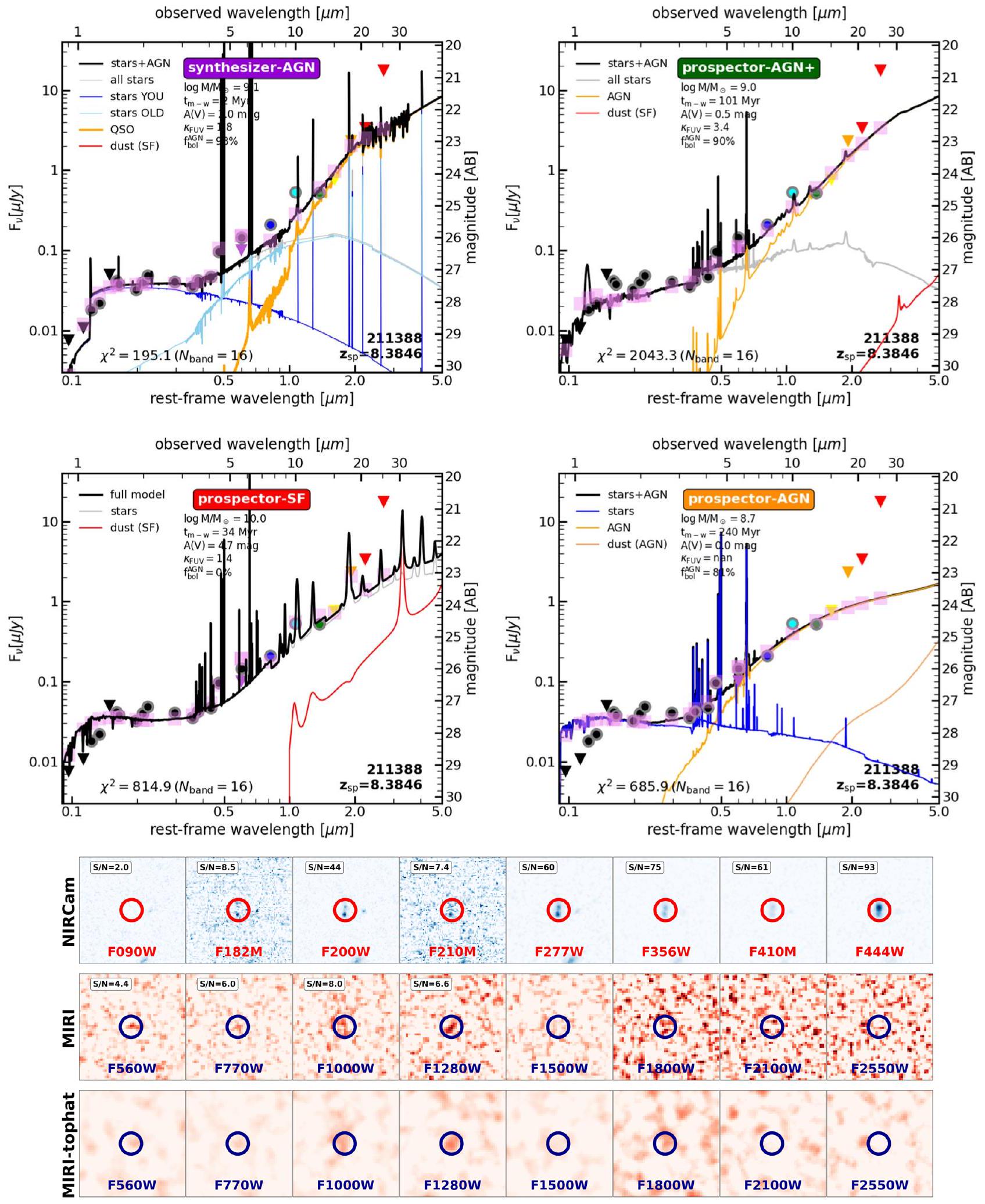 PROSPECTOR-AGN also provides a good fit to the optical-toNIR SED, but it has some issues fitting the sharp Lyman break indicated by the blue NIRCam bands (we remind the reader that the attenuation is fixed to 0 mag in these models). The best-fit properties are again consistent with a young, lowmass galaxy host and an obscured AGN, . The lack of MIRI constraints at LWs leads to best-fit models dominated only by the accretion disk emission even up to . However, a more significant contribution from the torus emission at would still be consistent with the upper limits, as shown in the SYNTHESIZER-AGN and PROSPECTOR-AGN+ fits.