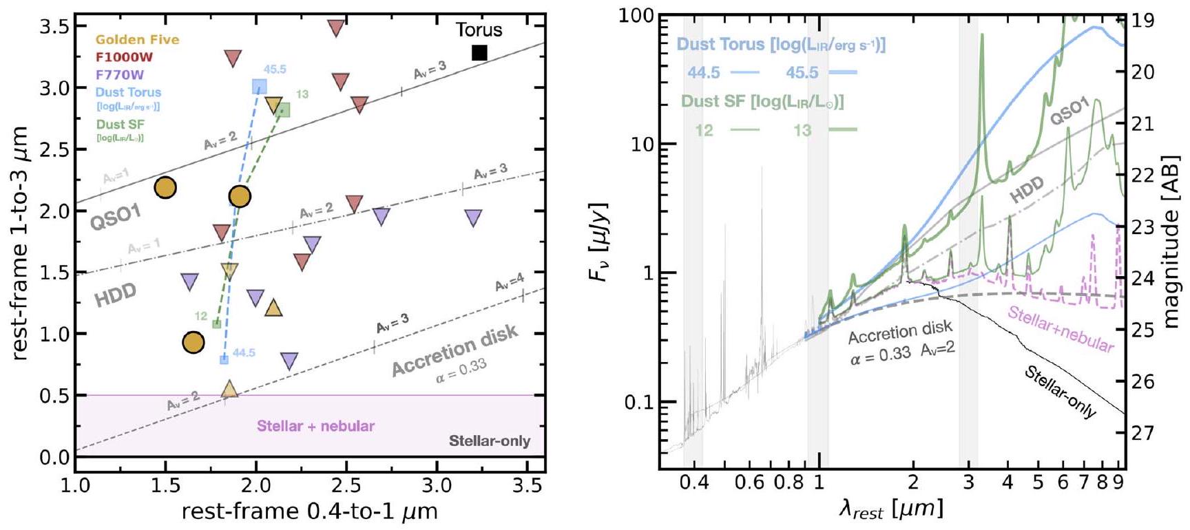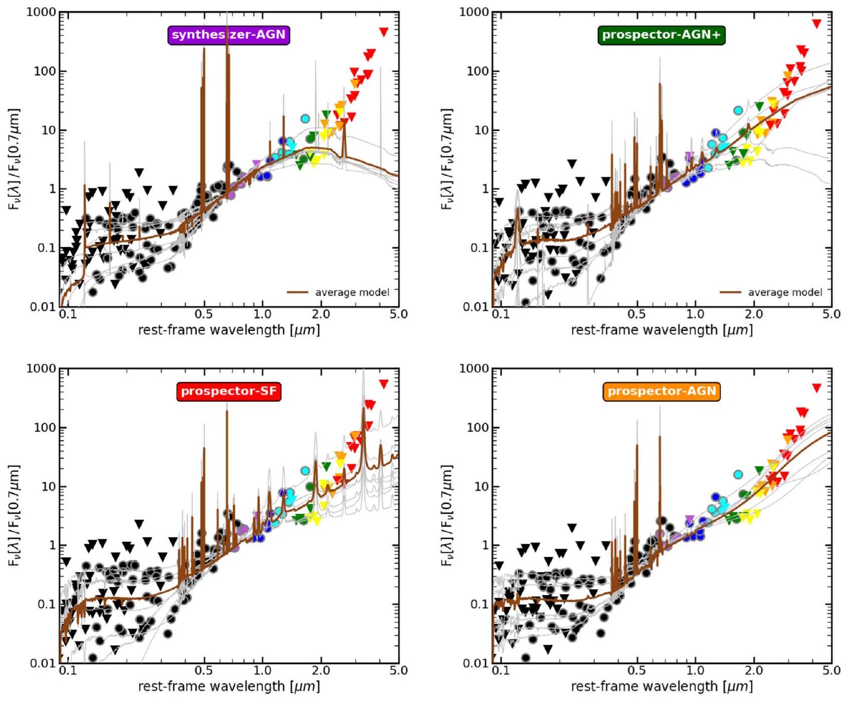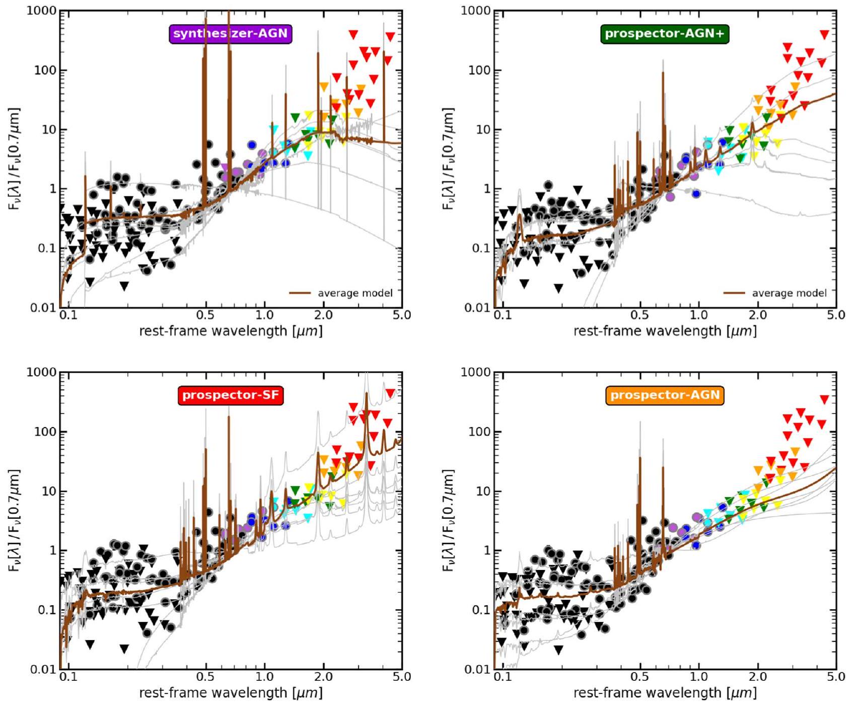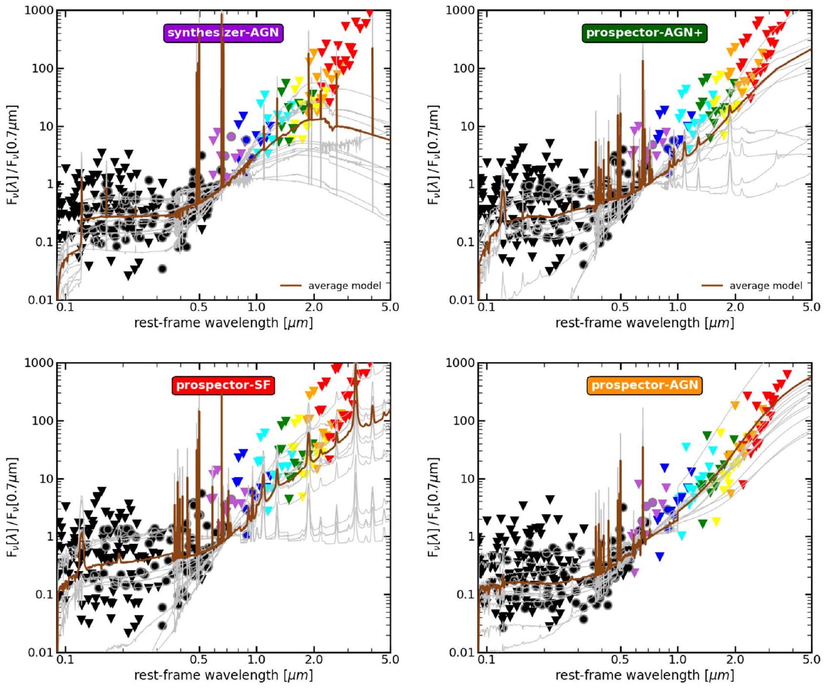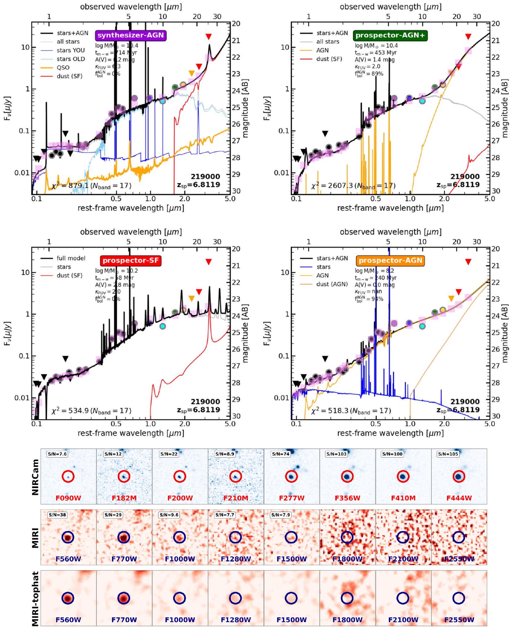 PROSPECTOR-AGN also provides a good fit to the optical-toNIR SED, but it has some issues fitting the sharp Lyman break indicated by the blue NIRCam bands (we remind the reader that the attenuation is fixed to 0 mag in these models). The best-fit properties are again consistent with a young, lowmass galaxy host and an obscured AGN, . The lack of MIRI constraints at LWs leads to best-fit models dominated only by the accretion disk emission even up to . However, a more significant contribution from the torus emission at would still be consistent with the upper limits, as shown in the SYNTHESIZER-AGN and PROSPECTOR-AGN+ fits.