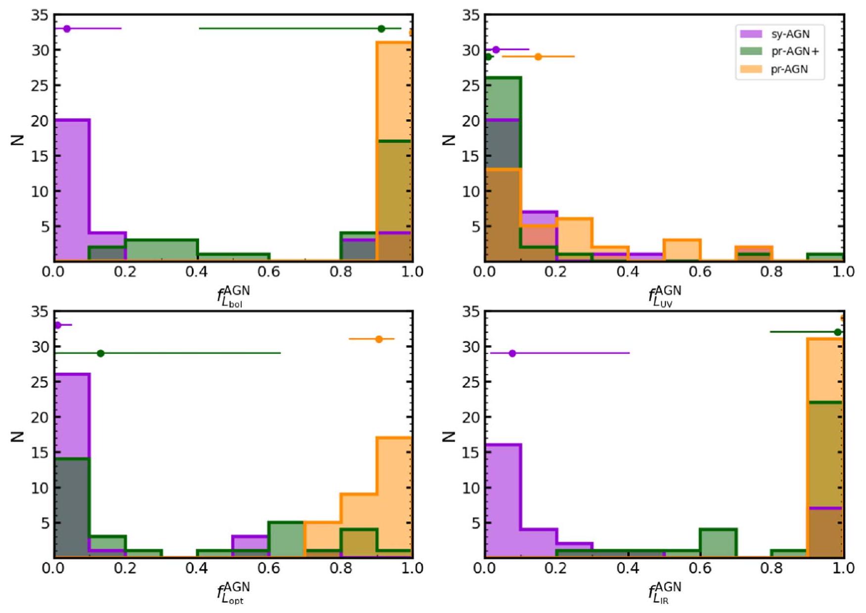 Figure 18 shows a similar result for MIRI undetected sources, the available data (limited to NIRCam) is well fitted by stars only. The upper limits for MIRI would be consistent with hot-dust emission from an AGN torus, but the current data are inconclusive.