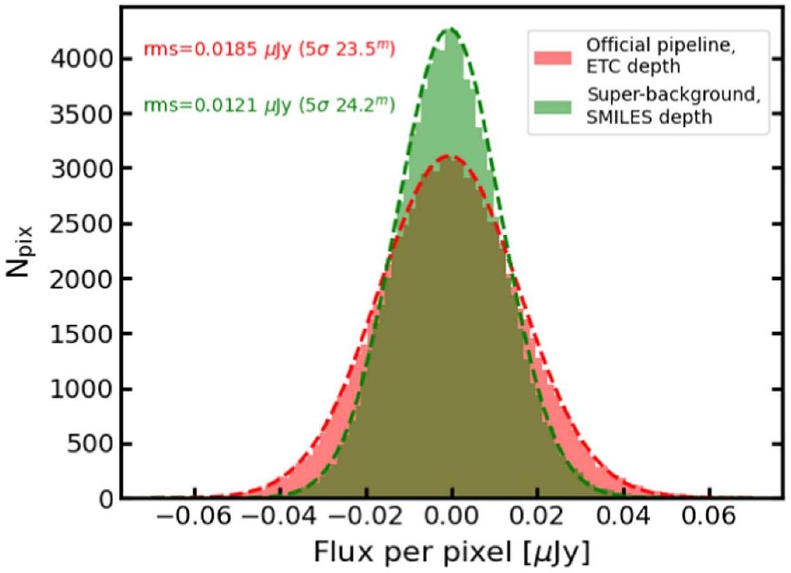 Figure 15. Histogram of pixel values (transformed to ) of the F1500W SMILES mosaic, after subtracting the median background. In red, we show the results for the mosaic produced by the official pipeline. In green, the results obtained with the bespoke version of the pipeline, embedded in the Rainbow database, and implementing a superbackground strategy. The two histograms are fitted to a Gaussian, whose dispersion is translated to depths for a point-like source, calculations based on measurements in an circular of radius equal to the FWHM of the PSF, and corrected for the limited size of the aperture using the calibration available in pmap 1138.