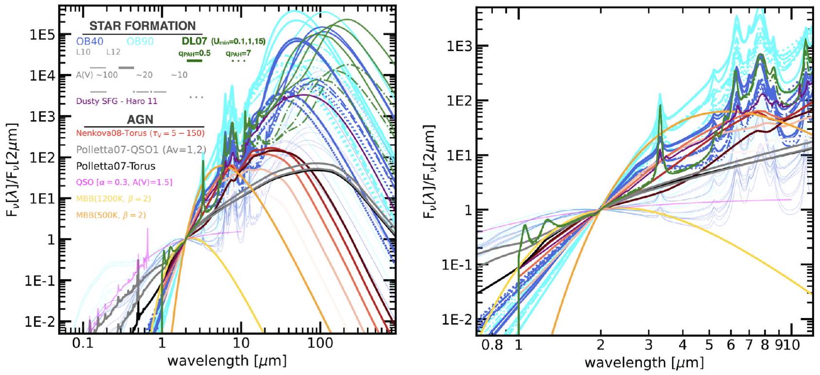 The MIR slopes of the Siebenmorgen & Krügel (2007) models are very similar to the slopes of AGN torus emission presented in Nenkova et al. (2008), which are used in our PROSPECTOR-AGN fits. Nenkova et al. (2008) parameterizes the emission from clumpy dust tori in terms of the number of clouds intercepting the visual, which depend on other parameters such as the torus thickness (outer to inner radii), the density and angular distribution of clumps, and the viewing angle. The subset of templates included in FSPS and then Prospector adopts typical assumptions for the majority of these parameters (see, e.g., Leja et al. 2018) leaving only the scaling (overall luminosity) and the optical depth of an individual dust clump at from 5 to 150 as free parameters. For the prospector-AGN fits, we remove any contribution from the accretion disk in the dust tori templates, and we instead model the disk separately following a combination of empirical QSO template plus a power-law (equivalent to ) with variable slope to 0.5 , as discussed in HernánCaballero et al. (2016) or more recently in Bosman et al. (2023), attenuated by a Calzetti law. For reference, the accretion disk model with is shown in Figure 16 in magenta. The main difference between the Nenkova et al. (2008) models and the ones in Siebenmorgen & Krügel (2007) dominated by star formation is the absence of PAH emission