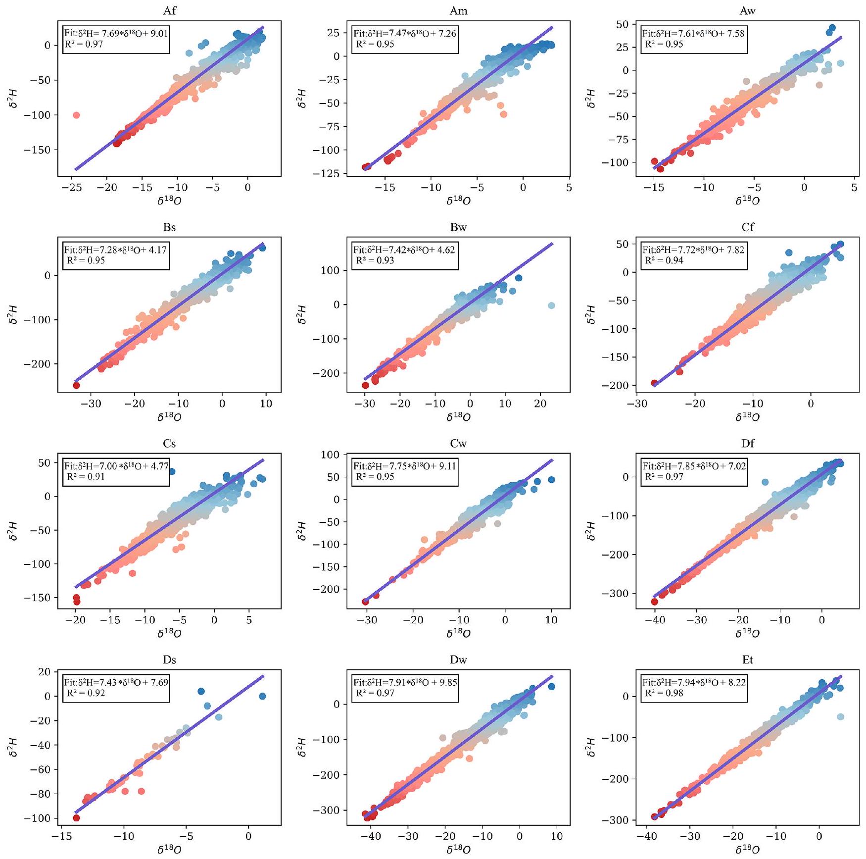 tively assess the impact of evaporation on different water bodies in arid regions. The majority of the global population is distributed in temperate regions. Therefore, with the global temperature rise, the climate change situation in temperate regions deserves more attention. In temperate climate zones, the differences in the stable isotope composition between different climate types become more significant. In the Mediterranean region controlled by the summer dry warm climate, the slope and intercept are the lowest, indicating that the temperature rise dominates the fractionation of hydrogen and oxygen stable isotopes in precipitation, and the region shows a trend of aridification under long-term average conditions. The westerly system is the main controlling circulation in this region, and the changes in precipitation stable isotopes reflect the attenuation trend of mid-latitude westerly moisture inward migration (Zhu et al., 2023; Shi et al., 2021). In polar