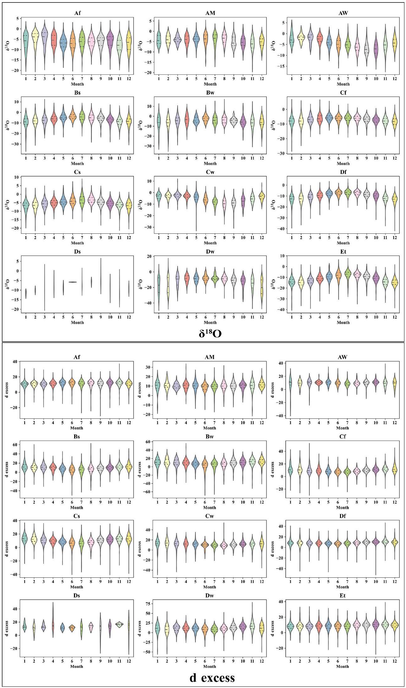 زيادة في هطول الأمطار. المناخات المعتدلة والباردة تظهر عمومًا تباينات موسمية ملحوظة. يظهر فائض الديوتيريوم في قارة أوراسيا نمطًا أقل في الصيف ونمطًا أعلى في الشتاء، مما يشير إلى التغيرات الموسمية في مصادر بخار الماء ومسافات النقل (F. Zhang et al.، 2021). يشير هذا بشكل عام إلى أن المناخ الصيفي في أوراسيا أكثر رطوبة، بينما المناخ الشتوي أكثر جفافًا. عادةً ما يشير فائض الديوتيريوم إلى درجة عدم التوازن في مصادر مياه البحر خلال عملية تبخرها، وعادةً ما يعتمد فقط على الظروف البيئية لمصدر التبخر. مقارنةً بـ