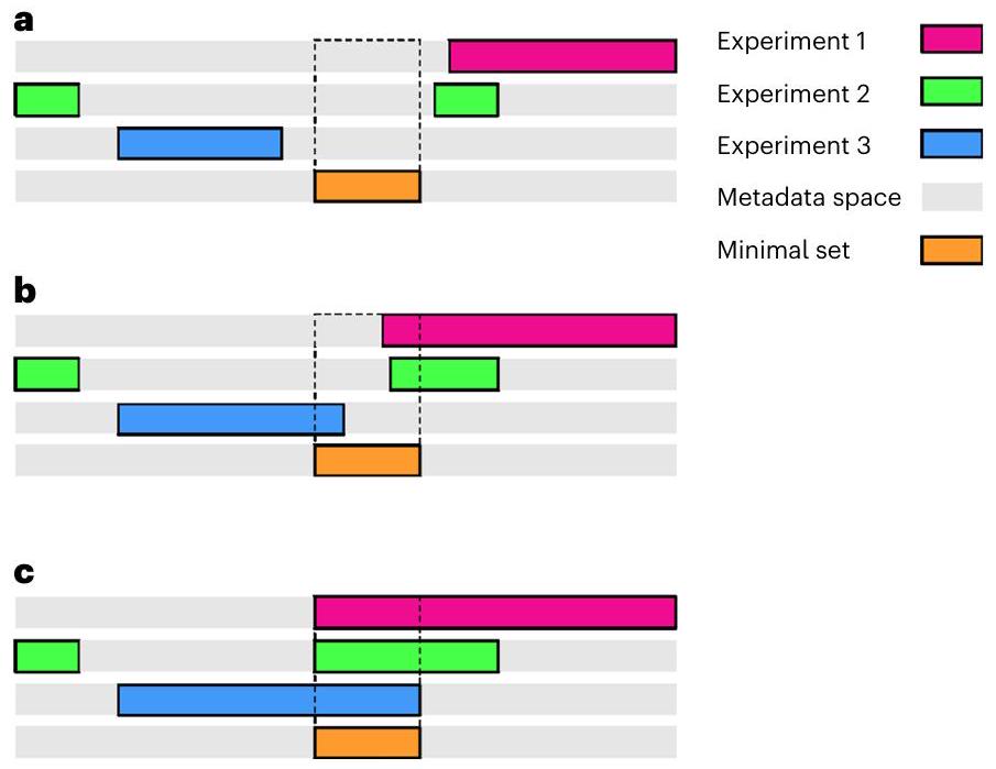 الشكل 1 | ثلاثة سيناريوهات توضح العلاقات بين مجموعات البيانات الوصفية من ثلاث تجارب مختلفة. يتم تصوير مدى مساحة البيانات الوصفية كمستطيلات رمادية. يتم تصوير مجموعة MNMS وتداخلها مع التجارب الثلاثة كمستطيل برتقالي، وصندوق ممتد مع محيط منقط، على التوالي. أ، لا تتداخل البيانات الوصفية، مما يؤدي إلى أسوأ سيناريو لإعادة استخدام البيانات. لا يمكن للباحثين اتخاذ أي قرار بشأن القدرة على إعادة استخدام البيانات. ب، يوجد فقط تداخل جزئي بين جميع التجارب الثلاثة. قد يحث هذا السيناريو الباحثين على ملء المعلومات المفقودة بمعرفة ضمنية، مما يؤدي إلى عواقب ضارة على جودة إعادة استخدام البيانات. ج، ترتبط جميع التجارب الثلاثة ببيانات وصفية تشمل المنطقة التي تشغلها المجموعة الدنيا. في هذه الحالة، يمكن للباحث أن يعمل بثقة على اختيار إعادة استخدام البيانات.