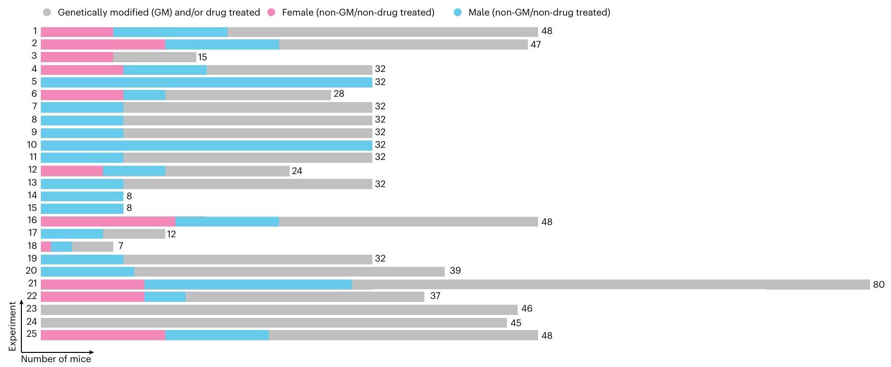 يمكن أن تحدد بسرعة الفئران الضابطة، غير المعدلة وراثيًا و/أو غير المعالجة دوائيًا من الذكور (الأزرق، ) والإناث (الوردي، ) في كل تجربة. يمكن تقسيم البيانات بشكل أكبر (على سبيل المثال، حسب السلالة، العمر وما إلى ذلك)، مما يمكّن المجرب من فهم الإمكانية لإعادة استخدام هذه البيانات لأسئلتهم واحتياجاتهم المحددة.