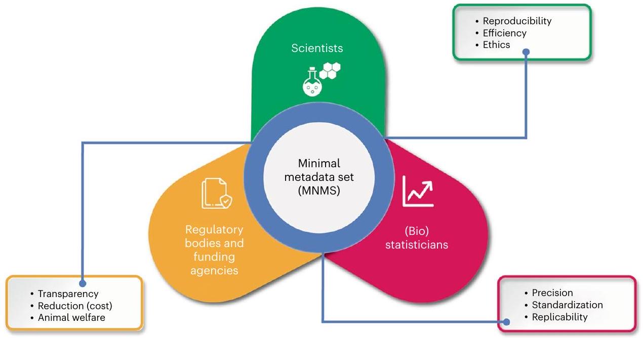 To minimize the effort needed for providing MNMS and maximize their impact, we have proposed a MNMS that aligns with ARRIVE 2.0, as set of guidelines that are gaining increasing acceptance within the biomedical research community and are accepted by peer-reviewed journals. By providing a mandatory and minimal set of controlled terminologies to describe the data, the MNMS would overcome challenges of ‘free text’ entries required by ARRIVE, which can result in entries of variable quality that are not easily comparable between publications, or no entries at all.