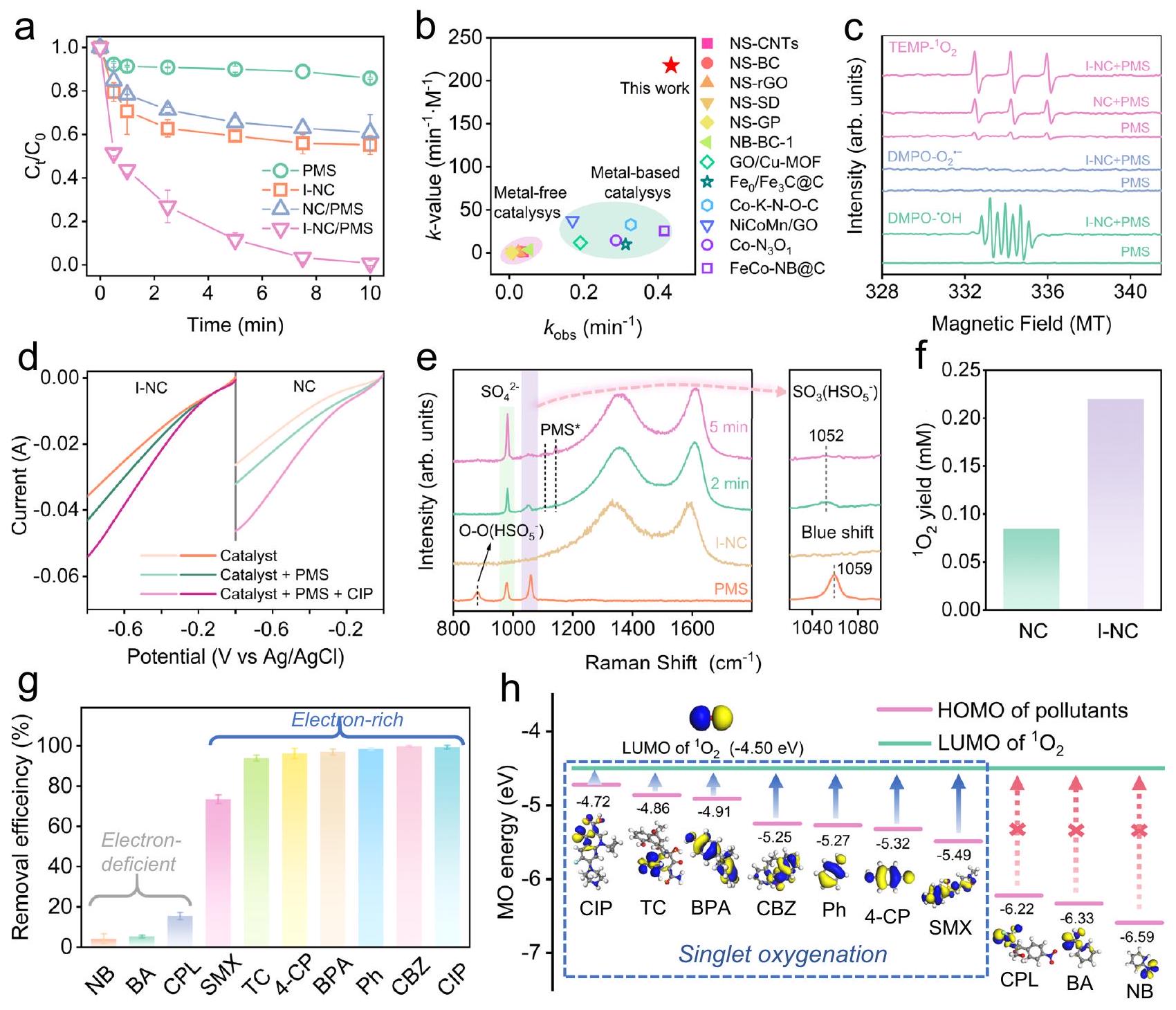 يمكن وصف تحلل CIP بشكل جيد بواسطة حركيات من الدرجة الأولى الزائفة. ثابت الحركية ( ) من I-NC/PMS ( كان أعلى بـ 10.1 مرات من NC/PMS )، و أضعاف أكبر من تلك الخاصة بالمواد الكربونية التجارية. ومن الجدير بالذكر أنلقد تفوقت I-NC على معظم المحفزات المتطورة من حيث تفعيل PMS الفعال في تحلل CIP (الشكل التكميلي 18). بالإضافة إلى ذلك، نظرًا لأنقد يختلف مع ظروف التفاعل ونوع المواد العضوية، نموذج حركي موحد ( – تم استخدام هذا النموذج لضبط القيمة.عن طريق قسمته على تركيز PMS وجرعة المحفز، وضربه في تركيز الملوث، لتقييم معدلات الإزالة بشكل موحد عبر أنظمة فينتون غير المتجانسة المختلفة.كما هو موضح في الشكل 3ب والموجز في الجدول التكميلي 5،-قيمة لـ I-NC (تجاوزت تلك الخاصة بجميع المحفزات الخالية من المعادن المقارنة (0.23 إلىمن حيث تفعيل PMS لتدهور CIP وكان أعلى من معظم المحفزات المعدنية الرائدة، على سبيل المثال،لـ.