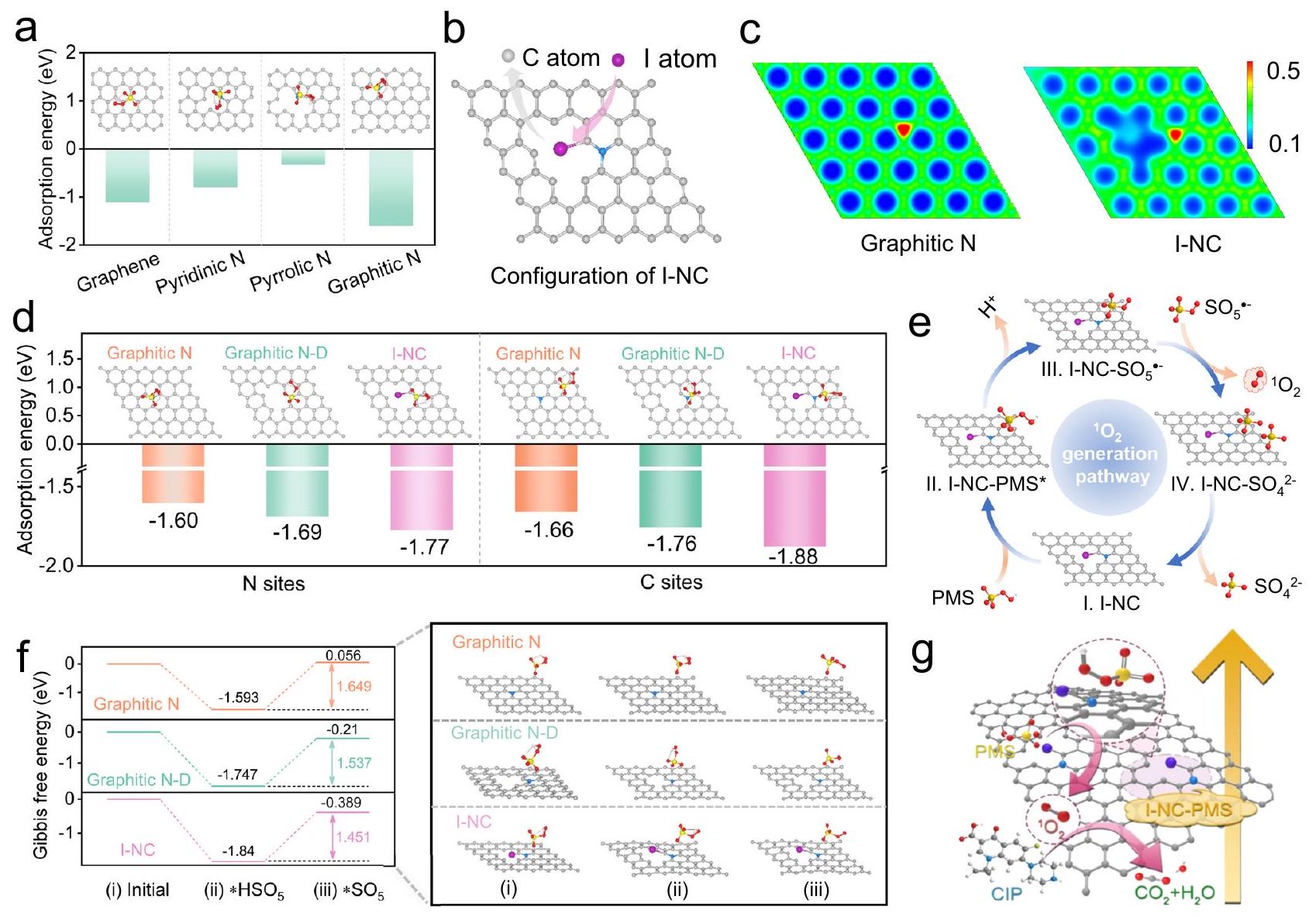 catalysts. Potential energy profiles of the reaction pathway for generating the species. Graphitic N-D model represent graphitic N with defect. Grey, blue, purple, red, yellow, and white spheres represent C, N, I, O, S, and H atoms, respectively. Diagrammatic representation of the CIP degradation mechanism in the I-NC/PMS system. The purple region and dashed area in Fig. 4g denote I-NC’s active site and I-NC-PMS complex, respectively. Source data are provided as a Source Data file.