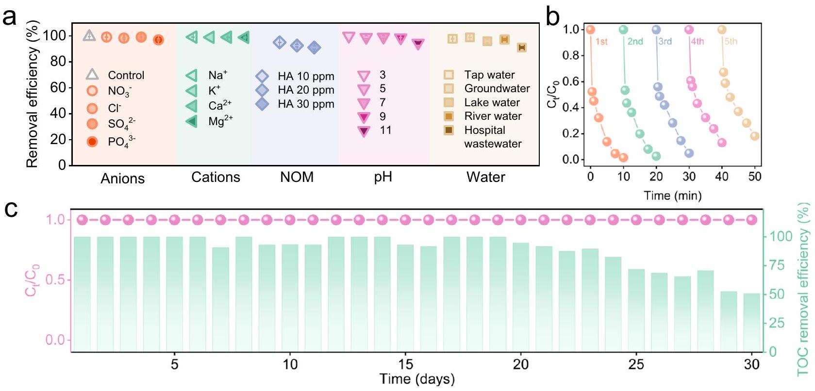 Fig. 5 | Application potential of I-NC/PMS system for water purification. a The removal efficiency of I-NC activated PMS systems in the presence of different ions, different humic acid (HA) concentrations, different initial pH, and different natural waters. Conditions: [catalyst] , (if any). Each data point in Fig. 5a is independent of the other. b CIP abatement in five consecutive