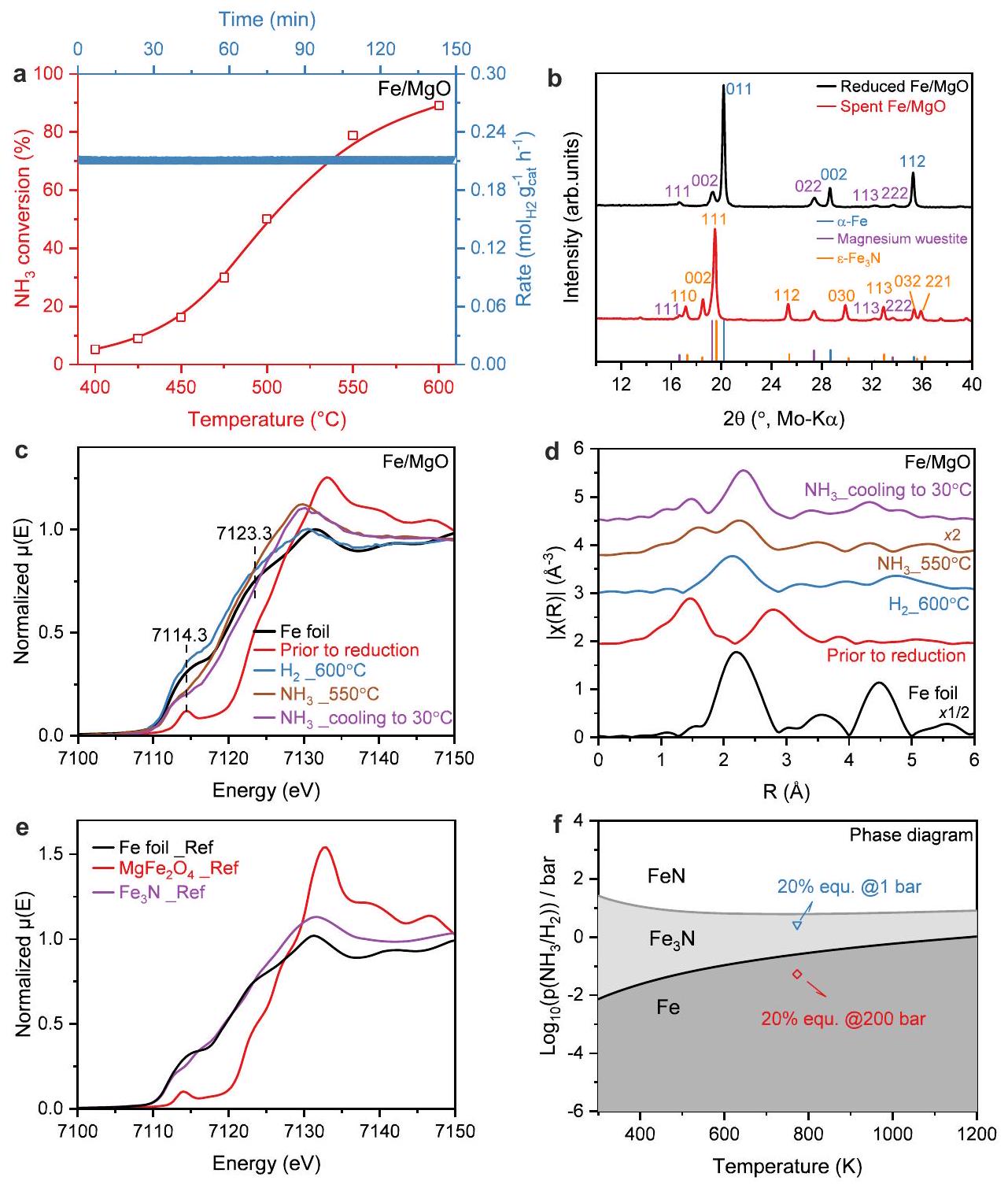 The catalytic performance of the catalyst in diluted ammonia showed stable activity in a temperature window from 400 to (Fig. 2a). The steady-state catalyst mass-normalized production rate at reached (Fig. 2a), which turned out to be in the moderate to upper range of performance reported previously for Fe-based catalysts (Supplementary Table 5). A reason for this relatively low activity was found in the structural analysis of the spent catalyst with using ex situ XRD and XES and operando XAS. The XRD pattern of spent catalyst without exposure to the air showed clear reflections of and iron-magnesium-wüstite, with comparison to the freshly reduced (Fig. 2b). Furthermore the valence-to-core X-ray emission spectrum (VtC XES) of the spent Fe catalyst is also consistent with the nitridation and supports the transformation of iron to iron nitride after catalysis (Supplementary Fig. 10) .
