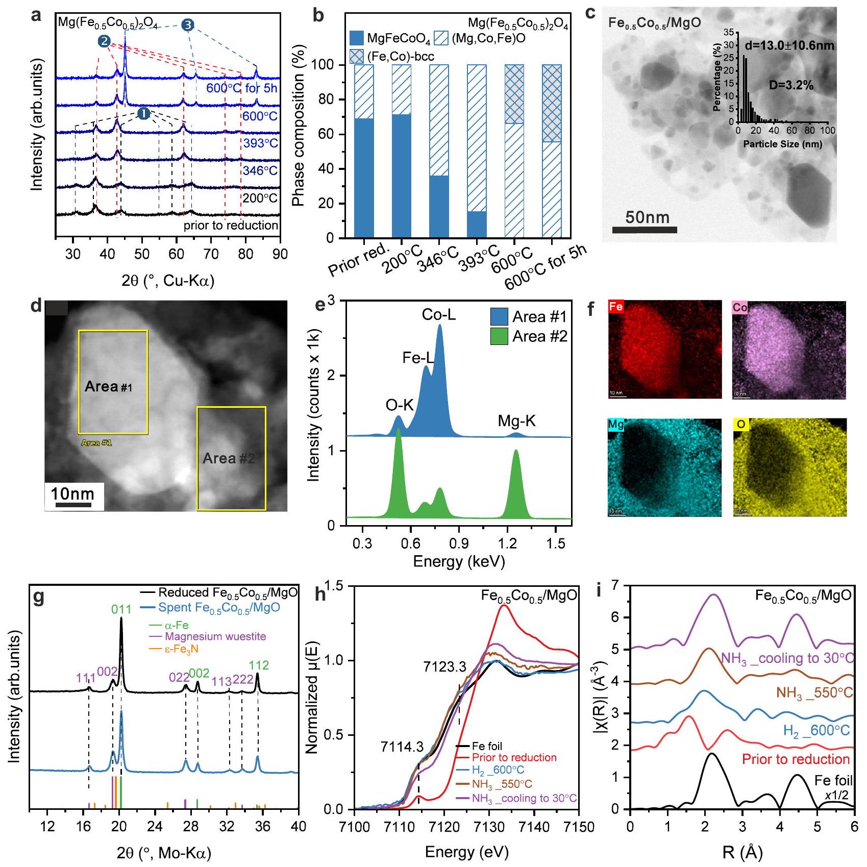 نمط حيود الأشعة السينية للمواد المستهلكةأظهر المحفز بعد تفاعل تحلل الأمونيا انعكاسات مشابهة لتلك التي تم تقليلها حديثًا، مما يشير إلى أن سبيكة الحديد والكوبالت المعدنية ظلت خلال التفاعل دون نيتريد (الشكل 3g). دراسات XAS أثناء التشغيل لـتم إجراء التفاعلات أيضًا باستخدام المحفزات تحت نفس ظروف التفاعل.ما قبل المحفز المقاس عندعرضت طيفيات XANES و EXAFS مشابهة لـالمحفز المسبق. عند التعرض لـتم تقليل المحفز تقريبًا إلى الحديد الكوبالت المعدني، حيث كانت حافة الامتصاص تقريبًا متداخلة مع تلك الخاصة بورق الحديد. تم ملاحظة تحول مشابه من نتائج XANES وEXAFS الخاصة بحافة كوبر Co K.