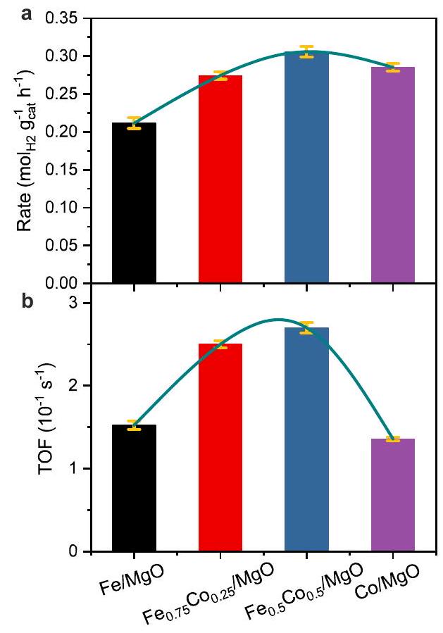 Comparing the catalytic performance of all four catalysts, the catalyst showed the lowest ammonia conversion for the reasons outlined above. The substitution of with Co in resulted in a remarkable improvement in the activity (Supplementary Figs. 17-18). However, the catalyst with the full substitution of Fe exhibited similar ammonia conversion as the bimetallic catalysts. In order to take the different metal dispersions of the four catalysts into account, the reaction rates of formation at were carefully evaluated and compared among these four catalysts, first on a catalyst-mass basis (Fig. 4a and Supplementary Fig. 18). The steady-state catalyst mass-normalized production