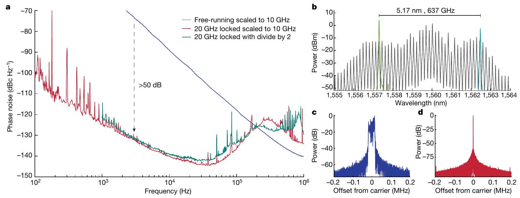 اثنان (أخضر). ب، الطيف البصري للميكروكومب (رمادي) ولازرات SIL (أخضر وزمردي). ج، د، طيف الترددات الراديوية لإشارة 20 جيجاهرتز في حالة التشغيل الحر (عرض النطاق الترددي للدقة (RBW) 100 هرتز؛ ج) ومقفل (RBW 1 هرتز؛ د).