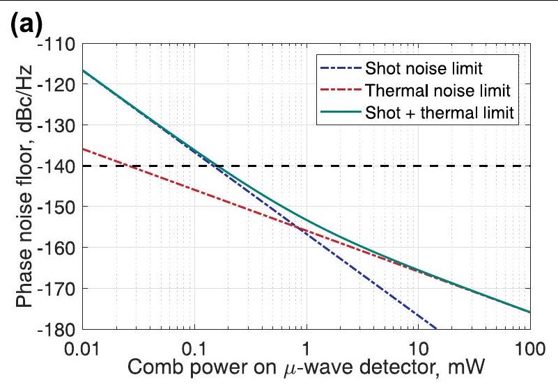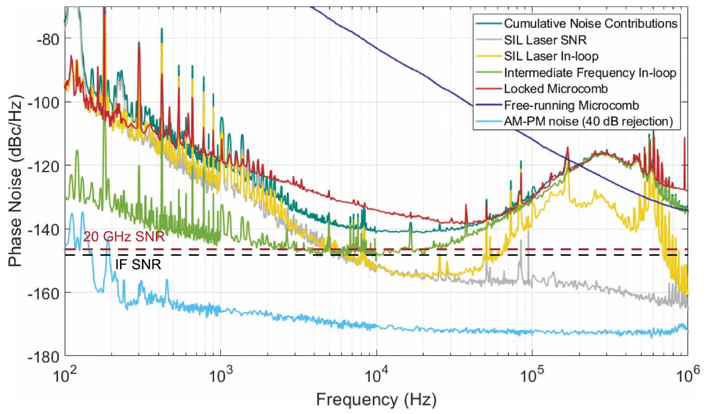 عند الترددات التي تقل عن 1 كيلوهرتز، تكون ضوضاء الطور لإشارة 20 جيجاهرتز محدودة بضوضاء الإلكترونيات لقفل PDH، والتي يمكن تحسينها عن طريق زيادة تقليل ضوضاء الطور 2P-OFD (أي، باستخدام ميكروكومب بعرض نطاق أوسع). عند الترددات التي تزيد عن عدة عشرات من الكيلوهرتز، تزداد ضوضاء الطور بسبب الكسب المحدود وعرض النطاق لحلقة التغذية الراجعة للميكروكومب. تتبع ضوضاء الطور لإشارة 20 جيجاهرتز عند الترددات التي تزيد عن 1 ميغاهرتز ضوضاء الطور للإشارة الحرة، والتي يمكن العثور عليها في المرجع 9. يمكن تقليل الضوضاء عالية التردد باستخدام حالة ميكروكومب حرة أكثر استقرارًا أو عن طريق تحسين عرض نطاق التغذية الراجعة. كما يمكن ملاحظته، في النطاق بين 1 و40 كيلوهرتز، لا تؤثر مساهمات الضوضاء المدرجة على توليد الميكروويف، والذي ينخفض كما