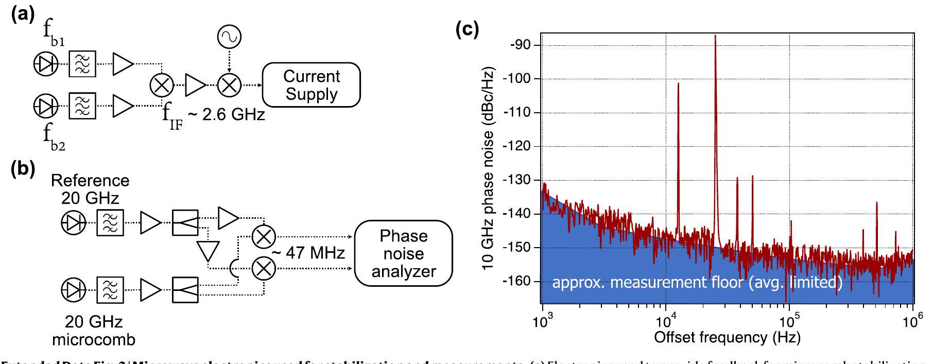 Extended Data Fig. 2b illustrates the experimental setup for measuring phase noise of the 20 GHz signal. To measure the phase noise of the microcomb, we used the ultrastable microwave from a self-referenced Er:fibre frequency comb