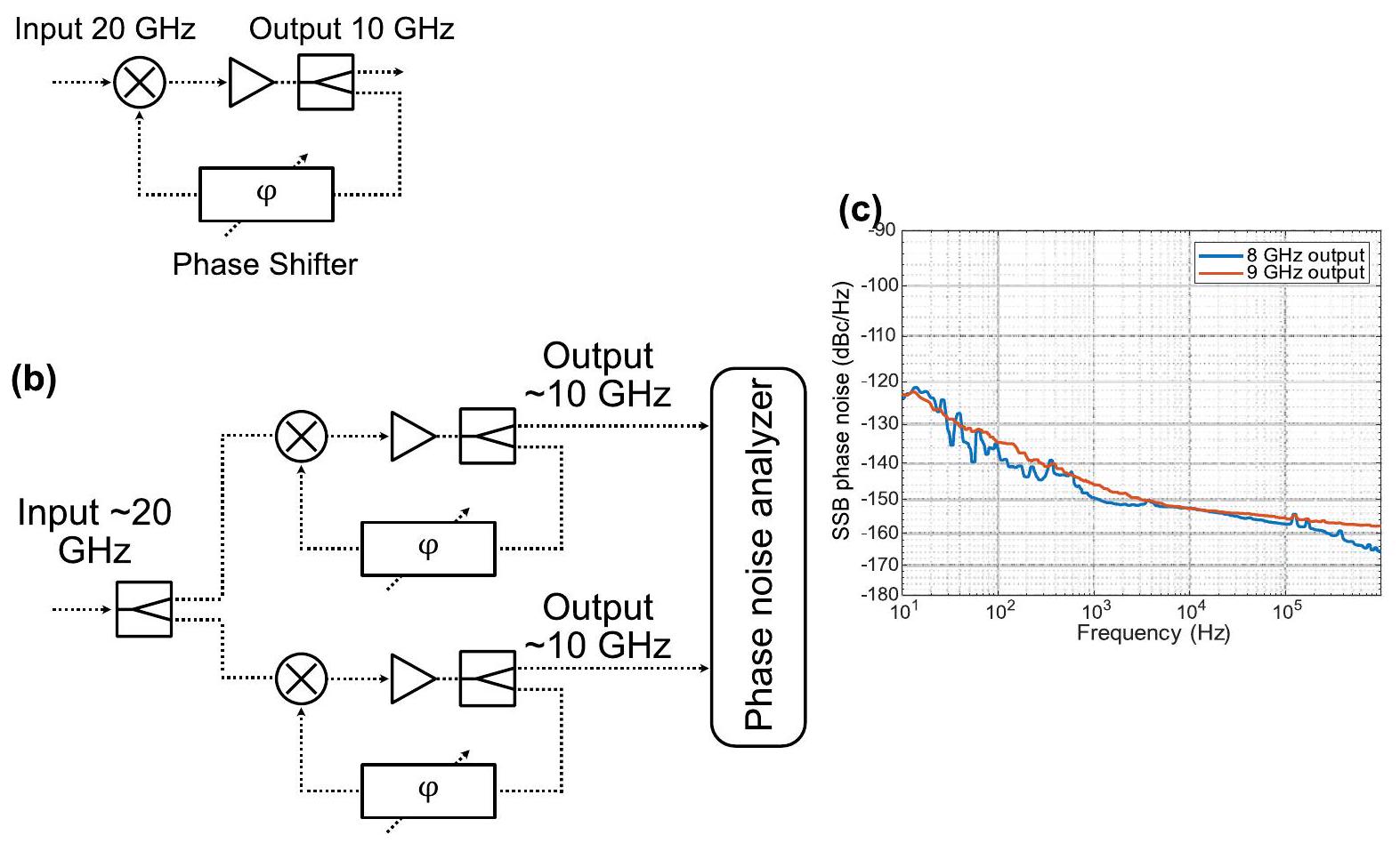 (b) Phase noise measurement setup of 20 GHz microwave signal. (c) Phase noise of the reference 20 GHz signal used for cross correlation.