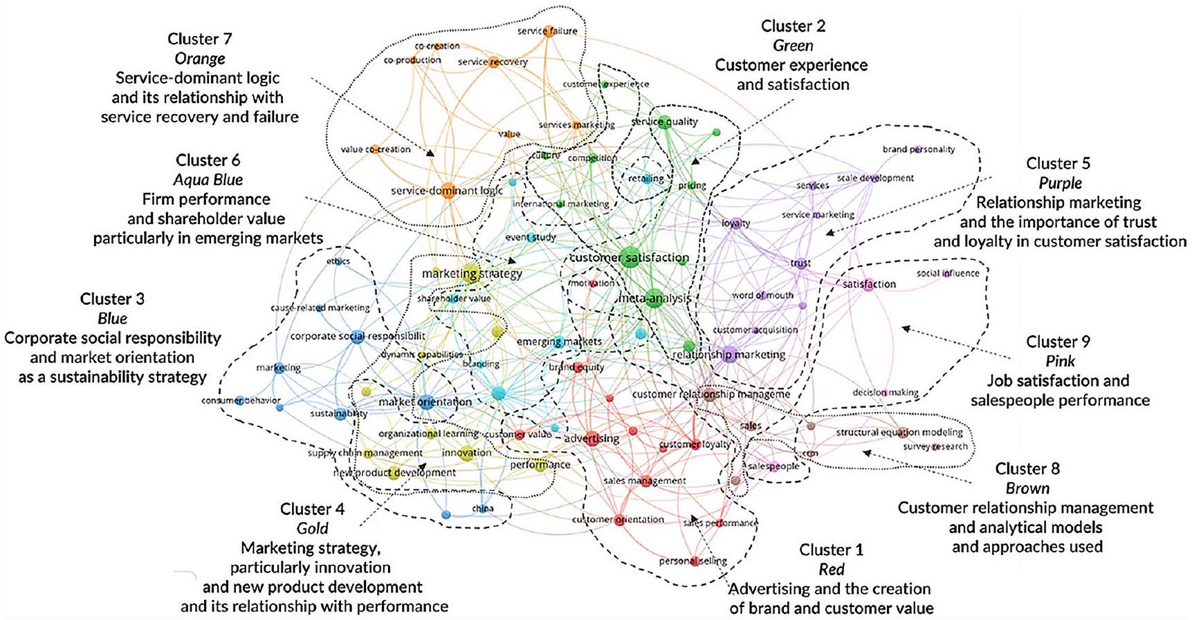 تظهر عدة رؤى من هذه التوضيح التي لن تكون واضحة بسهولة دون استخدام تقنيات الببليومترية. على سبيل المثال، فإن مواضيع قيمة العملاء والعلامة التجارية (المجموعة 1)، تجربة العملاء ورضاهم (المجموعة 2)، استراتيجية التسويق والابتكار (المجموعة 4)، وأداء الشركة وقيمة المساهمين (المجموعة 6) جميعها تقع في مركز الخريطة. قد لا يكون هذا مفاجئًا، نظرًا لأن هذه المواضيع كانت مركزية في نظرية وممارسة التسويق لعقود. بالمقابل، فإن مواضيع مثل منطق الخدمة السائد (المجموعة 7)، أداء مندوبي المبيعات (المجموعة 9)، و
