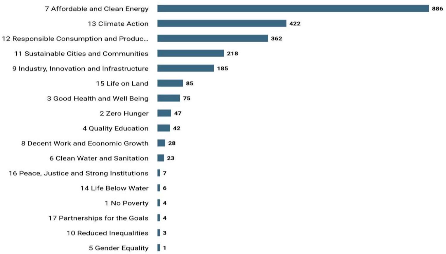 environmental sustainability and energy. The most addressed SDG is Affordable and Clean Energy (SDG 7), with 886 studies emphasizing renewable energy and optimization. Climate Action (SDG 13) follows with 422 studies, while Responsible Consumption and Production (SDG 12) has 362. Contributions to Sustainable Cities and Communities (SDG 11) and Industry, Innovation, and Infrastructure (SDG 9) include 218 and 185 studies, respectively. Lesser-researched SDGs include Gender Equality (SDG 5), No Poverty (SDG 1), and Reduced Inequalities (SDG 10), highlighting gaps and future opportunities for research.
