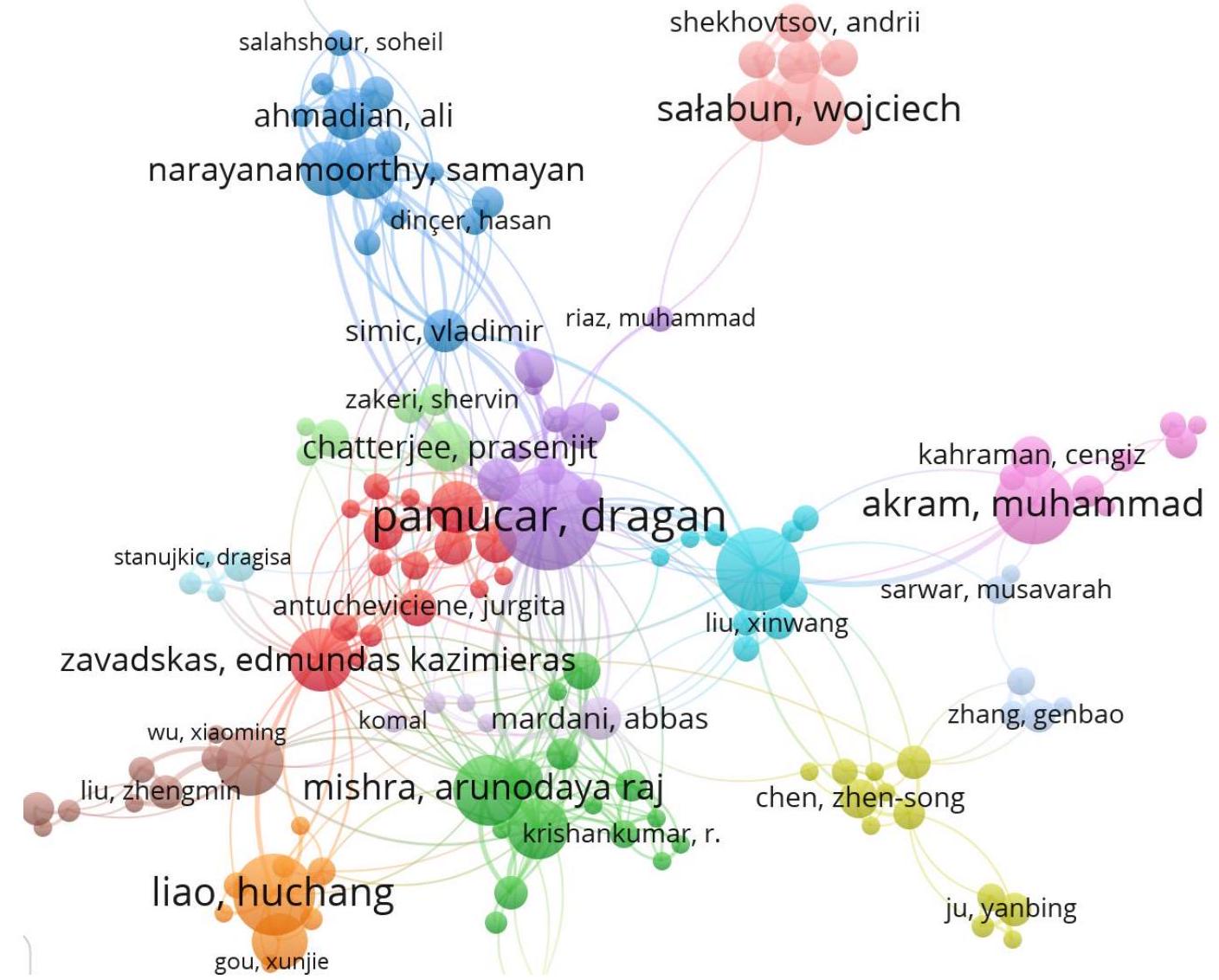 productivity and exceptional influence. While some, like Pamucar D. and Deveci M. lead with extensive publication records, others, such as Antucheviciene and Zhou, achieve remarkable perarticle impact, demonstrating the depth and quality of their research. Their work highlights the growing significance of MCDM in addressing complex decision-making challenges, bridging disciplines, and driving both theoretical advancements and practical applications globally.