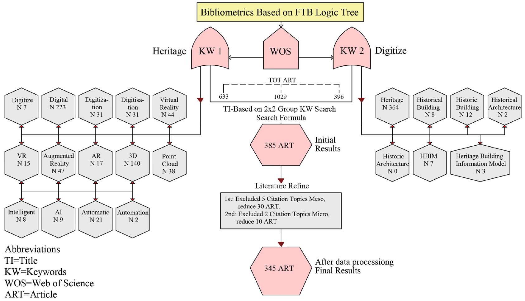 قاعدة بيانات العلوم تتعرف تلقائيًا على المصطلحات المفردة والجمع وتدمجها. عند البحث عن ‘بناء’، ستتضمن النتائج بالفعل مقالات تستخدم ‘مباني’ ككلمة مفتاحية، مما يتجنب إمكانية البحث المكرر أو فقدان الأدبيات ذات الصلة؛ 3) اعتبار توسيع الأفعال والصفات: ‘رقمي’ و’رقمنة’ هما الشكلان الصفي والفعل من الاسم ‘رقمنة’، بينما ‘تاريخي’ هو شكل موسع من ‘تاريخي’. يساعد التغطية الشاملة للمصطلحات الموسعة في زيادة دقة وشمولية البحث؛ 4) اعتبار اختلافات تهجئة الإنجليزية البريطانية والأمريكية: قد يكون لنفس المصطلح تهجئات مختلفة في الإنجليزية البريطانية والأمريكية. إذا تم اختيار ‘رقمنة’ ككلمة مفتاحية، فيجب أيضًا تضمين ‘رقمنة’ في مجموعة مصطلحات البحث؛ 5) اعتبار الكلمات المركبة والاختصارات: قد تستخدم العديد من المقالات المتعلقة بـ ‘نموذج معلومات المباني التراثية’ شكلها المختصر، ‘HBIM.’ عند البحث، يجب اعتبار كل من المصطلح الكامل واختصاره لضمان استرجاع جميع المقالات التي تستخدم أيًا من الشكل الكامل أو المختصر؛ 6) لا حاجة للتمييز بين الكتابة بحروف كبيرة وصغيرة: عند البحث عن ‘ذكي’، يمكن استرجاع المقالات التي تحتوي على ‘ذكي’ أو ‘ذكي’ في العنوان. من خلال اعتماد الاستراتيجيات المذكورة أعلاه، يمكن تحسين جودة استرجاع الأدبيات بشكل كبير. تم استرجاع ما مجموعه 385 مقالة بناءً على المعايير المحددة في الجدول 1.