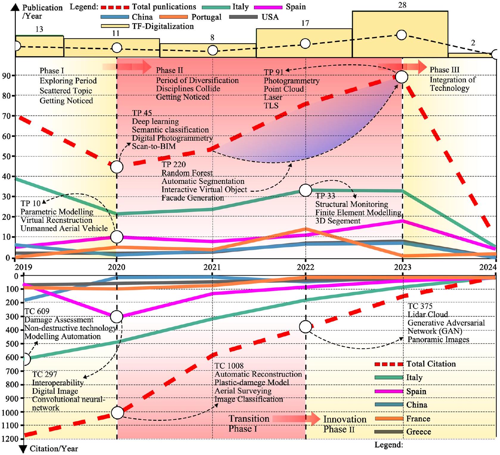 Findings: (1) The trajectory of DT in CHC has evolved through three distinct phases: an exploratory phase, a phase of diversified development, and a stage of technological integration and innovation, culminating in a multidisciplinary convergence with a notable surge in interest in 2023; (2) A substantial citation volume highlights the advanced level of DT application in European regions, such as Italy, Spain, Portugal, France, and China, with subsequent attention in Asia, South America, and North America. Conversely, regions with lower levels of urbanization experience relative marginalization; (3) Recent study has focused on four primary themes: ‘DT and reconstruction technologies’ and ‘risk assessment and interactive displays’; (4) Over the past six years, research trends have predominantly centered on HBIM, virtual museums, GOG, and laser scanning, followed by interests in parametric objects, GIS, ontology, and TLS; (5) Despite advancements, DT in CHC shows deficiencies in interdisciplinary collaborative research, evidenced by a fragmentation in knowledge and technological application; (6) Structural forecasts and maintenance have emerged as prominent topics, particularly in the specialized study of automated damage detection and maintenance in historic buildings.