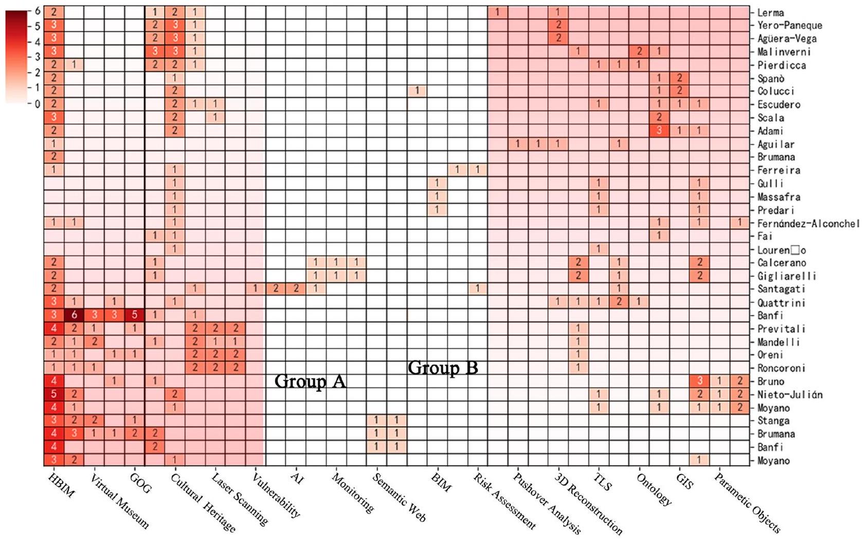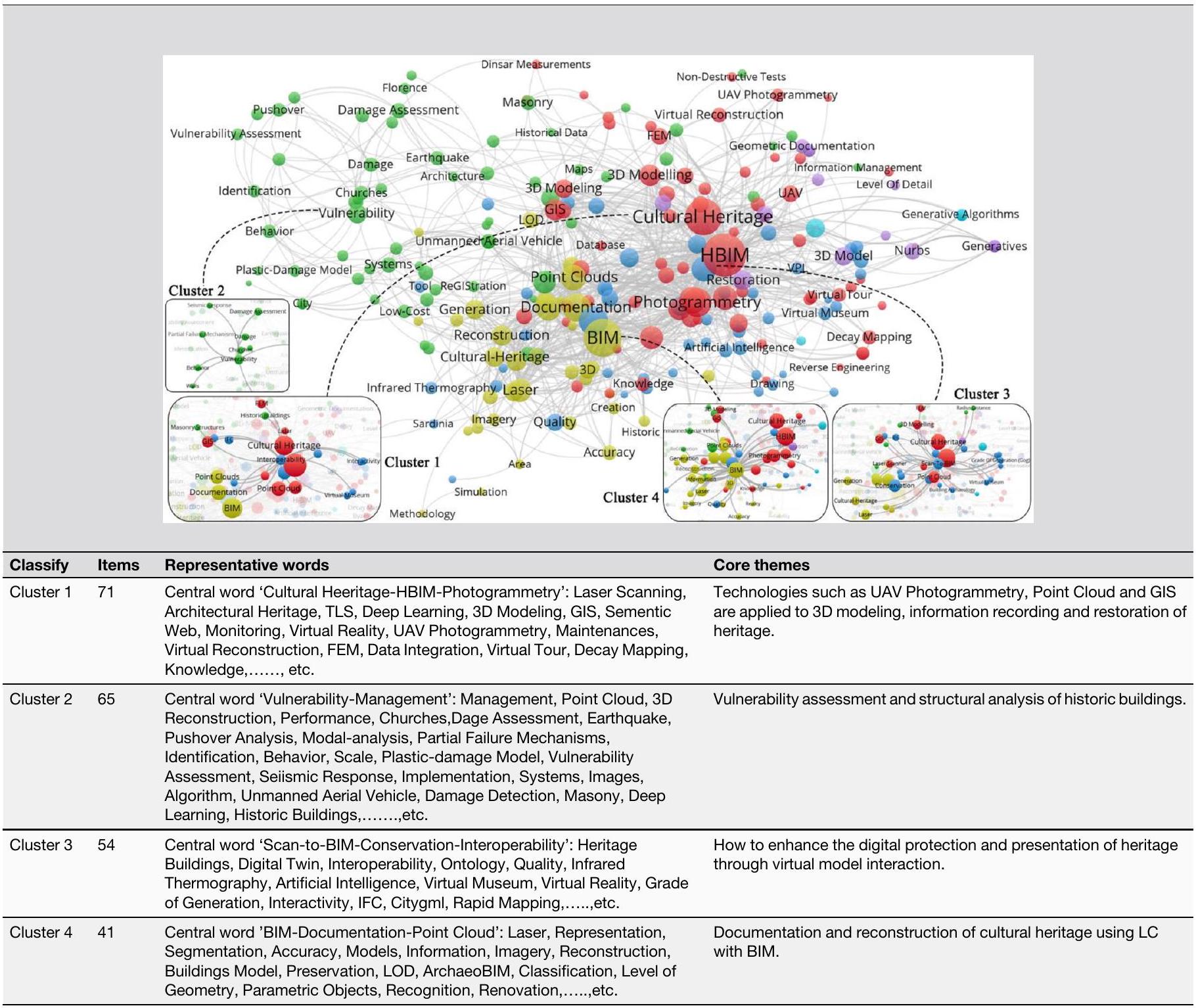 باستخدام الصيغة “allintitle: heritage review” للبحث في Google Scholar، وجدت هذه الدراسة أن عدد المنشورات سنويًا من 2019 إلى 2024 زاد من 143 إلى 173، مما يعكس اهتمام المجتمع المتزايد بـ CHC. بعد مراجعة العناوين والملخصات، تم تصنيف 173 ورقة تم استرجاعها اعتبارًا من 13 أكتوبر 2024 إلى خمس مجالات موضوعية. تركز الفئة الأولى على إدارة التراث والتخطيط، وتناقش نماذج الحوكمة، واستراتيجيات التخطيط، والحماية الفعالة لموارد التراث، خاصة في سياق الإدارة المستدامة وسط التحضر الحديث. تستعرض الفئة الثانية دور DT في CHC، وعرضه، وعمليات الترميم. تستكشف الفئة الثالثة العلاقة بين السياحة التراثية، والحماية، والتنمية الاقتصادية. تحقق الفئة الرابعة في التحديات التي تطرحها تغيرات المناخ على CHC، بما في ذلك تأثير الفيضانات والكوارث الطبيعية الأخرى على المباني التراثية. تعتبر الفئة الخامسة دمج التعليم مع التراث الثقافي، حيث تتناول كيفية نقل التراث من خلال التعليم وتطبيقه في نماذج التدريس الحديثة. تعكس 34 مقالة تطبيقات DT مباشرة في الحفاظ على التراث، مما يبرز إمكاناتها وقيمتها.