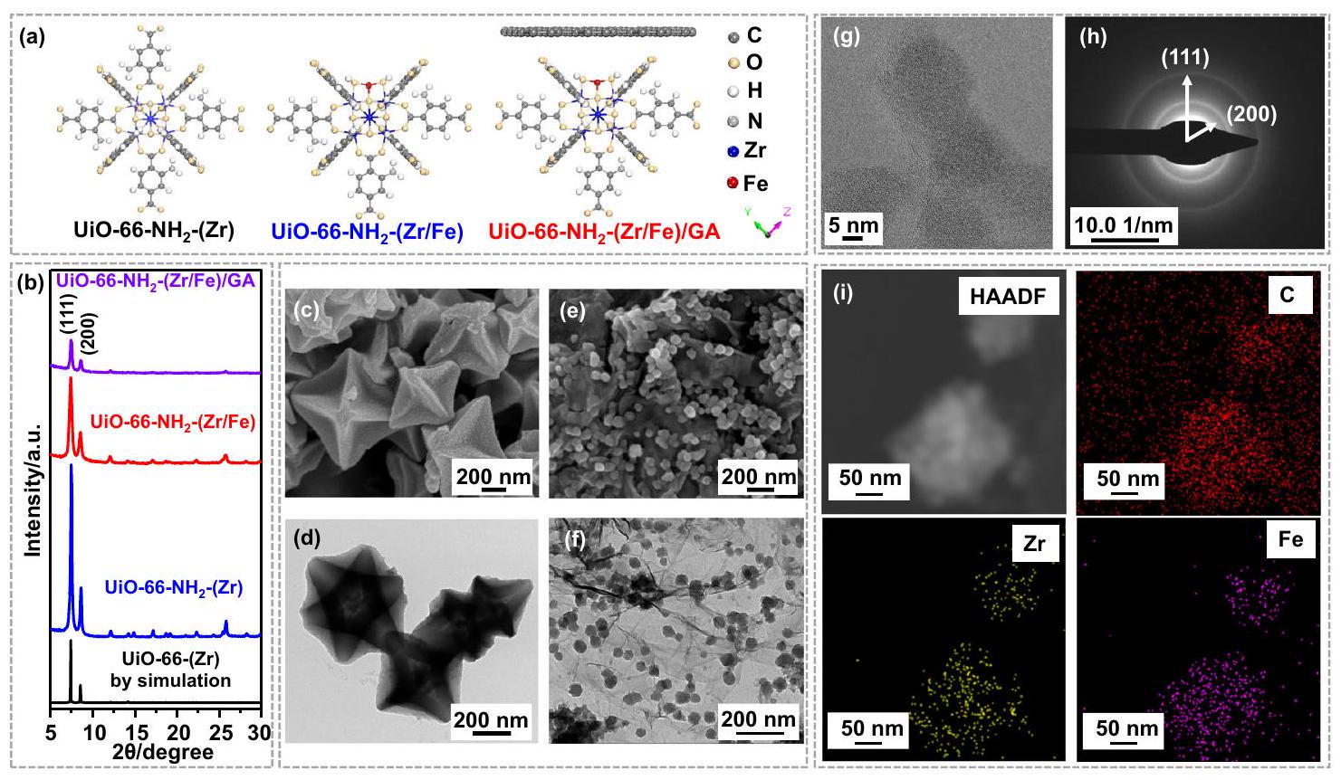 . Representative (e) SEM and (f) TEM images of UiO- . g HRTEM image, (h) SAED patterns, and (i) High-angle annular dark field (HAADF) and EDS elemental mapping images of UiO-66- .