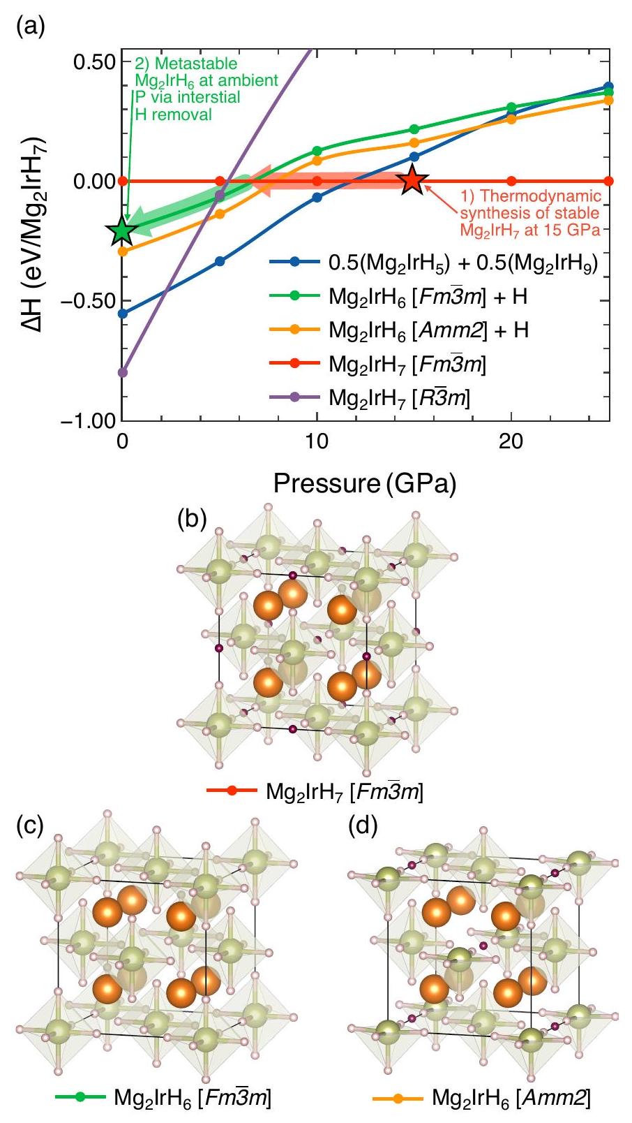 الشكل 1. (أ) اعتماد الضغط علىenthalpies التكوينالمراحل بالنسبة للمكعب المرحلة. يتم الإشارة إلى مسار تخليق الضغط بالأسهم، بدءًا من عند 15 جيجا باسكال (1) وتتبع تخفيف الضغط إلى 6 جيجا باسكال، تحت هذا المستوى المكعب يجب أن تشكل (2). (ب-د) الهياكل البلورية لـ و تدل الكرات البرتقالية والخضراء والوردية والبنية على ذرات المغنيسيوم والإيريديوم والهيدريد H والهيدروجين البيني، على التوالي.