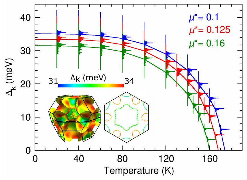 تظهر الشكل 3 توزيع فجوة الموصلية الفائقة كدالة لدرجة الحرارة لمجموعة منالقيم. تم حسابيتراوح بين 160 كيلوكلفن و 175 كيلوكلفن عند الضغط الجوي. هذه القيمة العاليةيمكن تبرير ذلك من خلال فحص كثافة الحالات عند مستوى فيرمي في الشكل 4، حيث توجد تفردة شبيهة بفان هوف (VHS) ناتجة عن الأشرطة المسطحة على طول مسار التناظر العالي L-W. من غير المحتمل أن تؤثر تأثيرات الترابط بشكل كبير على الحسابات.لا تتأثر بشكل كبير كل من VHS وتشتت الفونون بإدراج معامل هوبارد.، على الإير-مدارات (انظر الشكل التكميلية S8).