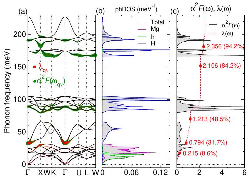 الشكل 5. (أ) انتشار الفونونات على طول مسار عالي التماثل في منطقة بريلوان. نصف قطر الدوائر الحمراء والخضراء في اللوحة (أ) يتناسب مع مقدار و لكل وضعية فونون، على التوالي. (ب) الكثافة الإجمالية (بالأسود) وكثافات حالات الفونون المتوقعة (phDOS) على ذرات المغنيسيوم (بالماجنتا)، والإيريديوم (بالأخضر)، والهيدروجين (بالأزرق). (ج) دالة الطيف الإيلاشبرغ المتساوية الاتجاه.وقوة اقتران الإلكترون-فونون المعتمدة على التردد التراكميتشير الدوائر الحمراء المميزة إلى المجموع التراكمي (والكسر) لـ.