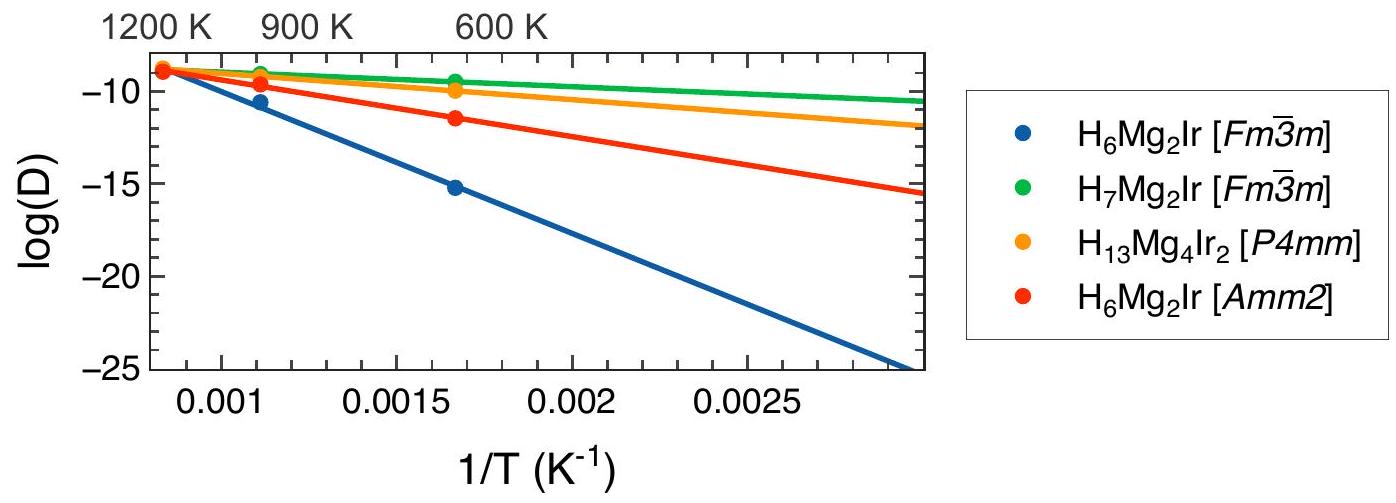 In figure 7, we plot the of the diffusion coefficient for the hydrogen atoms, , as a function of inverse temperature. A linear fit is used to extract the activation energy, , from the Arrhenius relationship, . The activation energies are shown in table I; The cubic phase of has the largest activation energy.