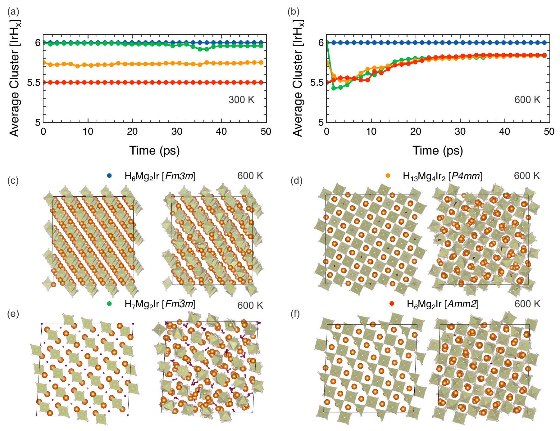 FIG. 8. (a-b) Ir-H cluster sizes during the MD trajectories. (c-f) Snapshots of the trajectories at 0 (left) and 50 ps (right). Ir-H clusters are shown by polyhedra, Mg atoms by orange spheres. Hydrogen atoms not in an Ir-H cluster are shown by maroon spheres.