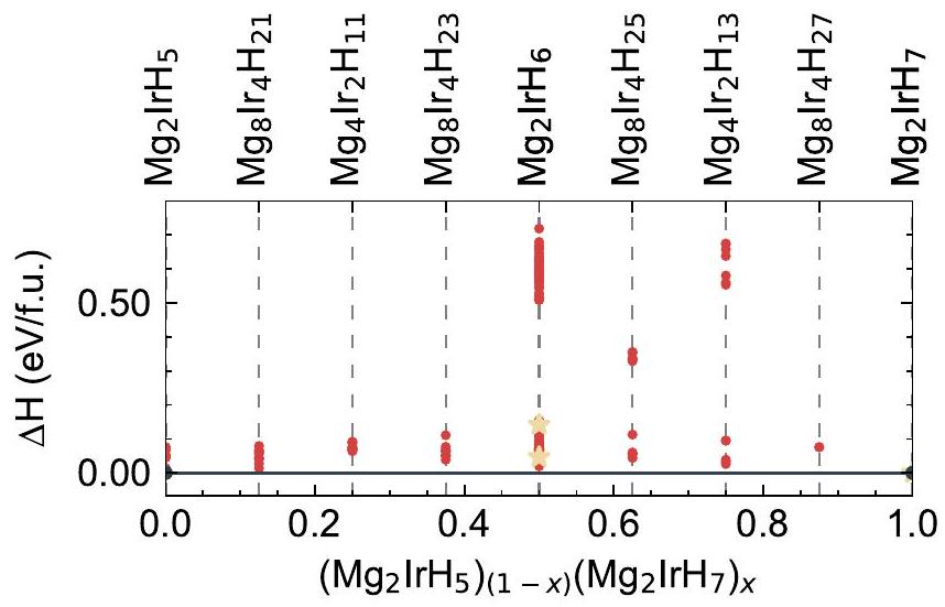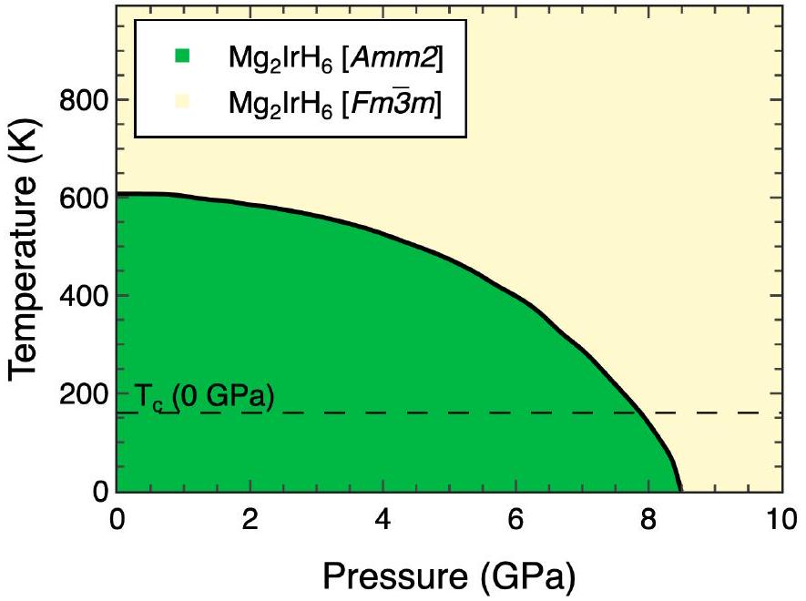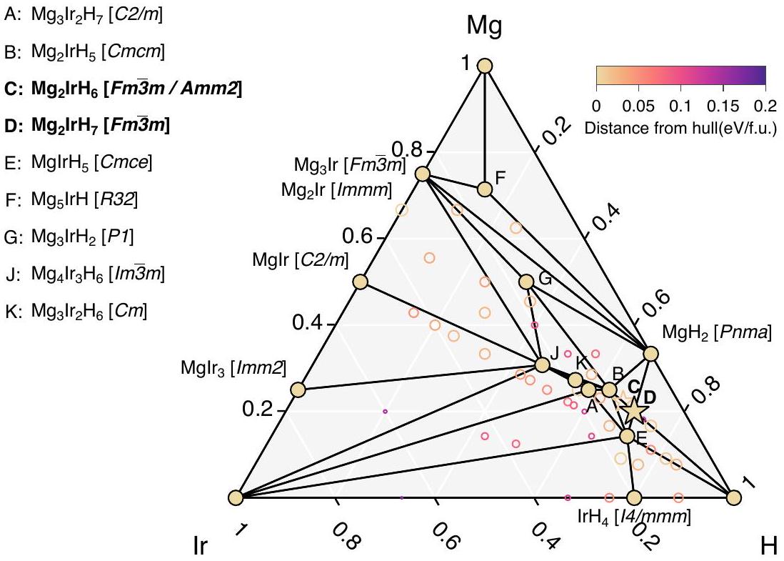 هنا نقترح ضغطًا جويًا مرتفعًا-هيدريد؛ مرحلة مكعبة من – هيدريد ثلاثي غير مستقر عند الضغط الجوي. يتكون الهيكل من أيونات الإريديوم والمغنيسيوم السداسية الأوجه التي تشغل و مواقع ويكوف لـشبكة مع (انظر الشكل 1(c)). تشغل ذرات الهيدروجين المواقع التي تشكلالعناقيد الهيدريدية. هذه المرحلة أقل منذرة من الغلاف المحدب عند 15 جيجا باسكال.