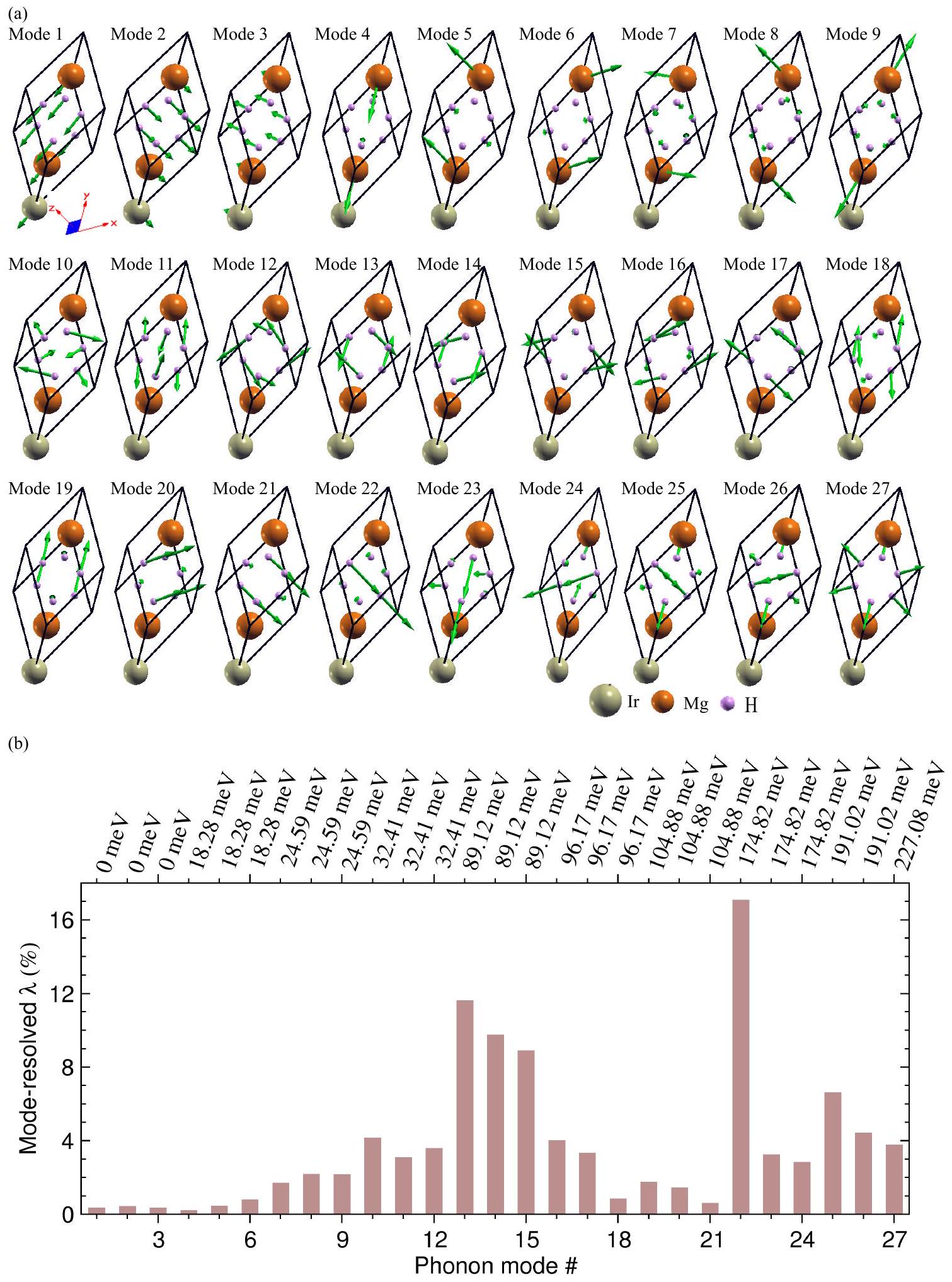 FIG. 12. (a) Visualization of phonon eigenmodes at the point, and (b) mode-resolved . -axis labels indicate the phonon mode index with their eigenvalues at the point.