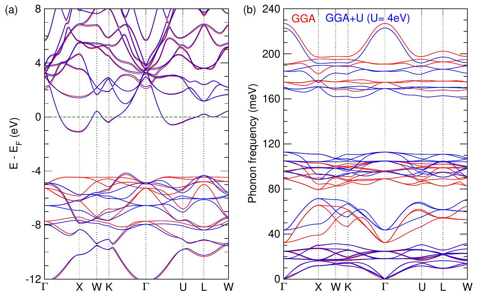 FIG. 13. (a) Electron and (b) phonon dispersion calculated using GGA- (red) and GGA+U (blue)-XC functionals. Hubbard ( ) correction is included in correlated Ir- orbitals using the method of Cococcioni and de Gironcoli [45] as implemented in QE package.