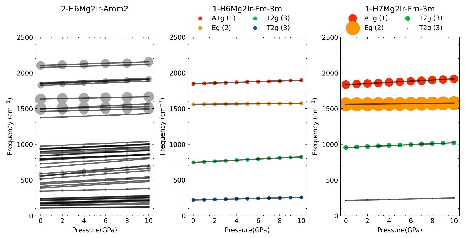 الخصائص الاهتزازية، لا سيما في الهيدريدات. لتقييم أهميتها للهيكل المكعب، استخدمنا تقريب الهارموني الذاتي المتسق العشوائي (SSCHA) [40]. نلاحظ أن أوضاع الاهتزاز للـ Ir و Mg تبقى تقريبًا دون تغيير عند الانتقال من التقريب الهارموني إلى التشتت المصحح غير الهارموني (انظر الشكل S12 في الملحق). الترددات المنخفضة أوضاع بين تصلب، بينما التردد العاليتخفف الأوضاع فوق 150 مي إلكترون فولت، تقريبًا بنفس المقدار بمقدار 15 مي إلكترون فولت. نحن نعزو تصلب أوضاع H إلى تأثيرات عدم التناسق، بينما التخفيف يعود بشكل رئيسي إلى تضمين الحركة الأيونية الكمومية، كما لوحظ في مواد الهيدريد ذات الضغط المنخفض الأخرى [55]. تظهر هذه الحسابات أن تضمين تأثيرات عدم التناسق الكمومي لا يغير بشكل كبير من انتشار الفونونات في الشكل المكعب..