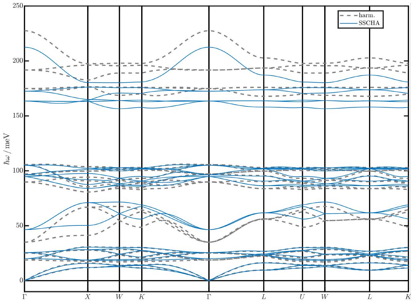 تتم الحسابات ضمن إطار SSCHA باستخدام وضع الاسترخاء عند حجم ثابت ضمنسوبرسيل. يتضمن ذلك تقليل الطاقة الحرة عن طريق ضبط المواقع الذرية المتوسطة. ) وثوابت القوة ( )، الذي يتم تنفيذه من خلال حزمة SSCHA بايثون [40]. تقديراتنا الأولية لـ و تستند إلى مواقع الذرات في حالة التوازن من DFT ومصفوفات الديناميكا DFPT، على التوالي. يتم الحصول على هذه من-شبكة.