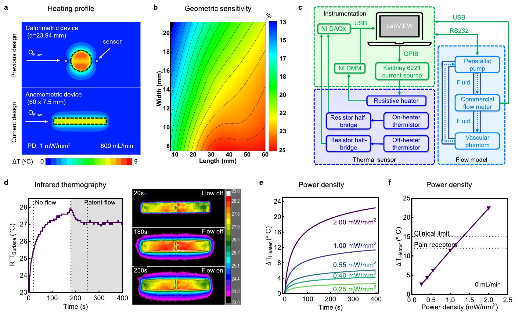 Localized FEA measurements across the heater surface show the highest flow sensitivity at the furthest downstream location, which we chose as the location for our contact sensor (Supplementary Fig. 5). This component exhibits a stronger dependence on device-tissue contact than the heater, as indicated by thermal resistance calculations, allowing us to distinguish between good and poor conformal adhesion. Figure 2c and Supplementary Fig. 6 display the benchtop flow monitoring system, including (i) instrument control by a custom LabVIEW program for supplying direct current to the heater and monitoring temperature-dependent voltage and resistance values, (ii) analog front-end circuitry for the thermal sensing components, and (iii) a benchtop vascular flow model controlling through a vascular phantom. We calculate a uncertainty in temperatures measurements, arising from power supply variations in these instruments (Supplementary Methods and Supplementary Table 3). Infrared (IR) thermography in Fig. 2d demonstrates the application of direct current and subsequent joule heating of a heater on a device conformally mounted atop a silicone phantom skin. A continuous resistive trace, replacing the dense array of surface-mounted resistors in previous systems, ensures spatially uniform heating and device pliability. Initiating patent-flow conditions at 180 s beneath the skin causes a drop in surface IR temperature.