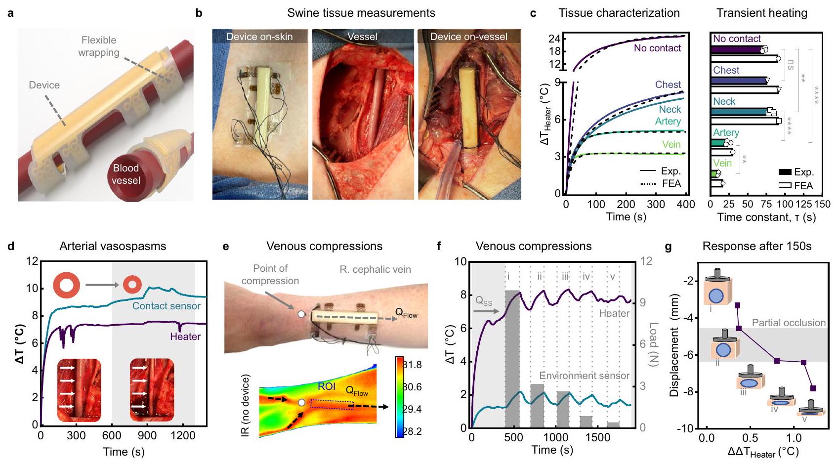 Fig. 4 | In vivo device application and monitoring in swine. a Image illustrating conformal wrapping of device around curved vasculature using flexible wrappings. b Camera images depicting an encapsulated device application on the skin (left), the exposed femoral artery in a swine before device application(middle), and after the device is mounted on the femoral artery (right). c Thermal measurements (left) and time constants (right) with no contact, chest, neck, artery, and vein tissues are depicted for experimental data and FEA simulations. Time constant is defined as the elapsed time when the heater transient reaches of (no contact and neck technical replicates, chest technical replicates, vein and artery technical replicates, collected for two pigs with the exception of chest measurements). d Device measurements prior to and during (shaded) vasospasms. Inset photograph shows the femoral artery before and during contraction. e-g On-body