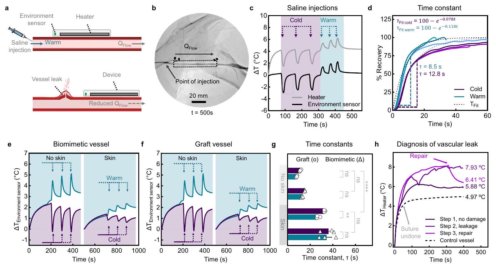 Fig. 5 | In vivo assessment of local, rapid, temperature changes in the blood. a Schematics illustrating local perturbations to upstream blood temperature and supply, through saline injections and vascular tears, respectively. Injections with 30 mL of cold and warm saline in the artery occur proximal to the mounted device. Angiogram of unobstructed artery with mounted device, point of injection, and direction of flow indicated. c In vivo flow sensing and rapid response to successive injections. d Percent recovery profiles for cold and warm saline injections fitted with an exponential form to yield time constants of 12.8 s and 8.5 s , respectively, to reach quasi-steady-state conditions defined as of . e Benchtop modeling of cold ( ) or warm ( ) saline injections through a biomimetic vessel at patent-flow without and with a biomimetic skin layer. Corresponding data with a synthetic graft. Time constants for panels ( ) ( technical replicates in triplicate per vascular models). h Time course data of venous exsanguination and repair of a swine (e). jugular vein showing differences in sensed under (step 1) no damage, (step 2) leakage following suture removal, and (step 3) repair through venous closure conditions. Simultaneous sensing of undamaged control vessel during step 2 shows no systemic response. Device PD is for all runs. Data are presented as mean values SEM. , . Two-way ANOVA with Šídák post hoc for pairwise comparisons of warm and cold injections into each phantom model. Tukey post hoc test is applied for comparisons between the graft and biomimetic vessel, with and without a skin layer. Source data are provided as a Source Data file.