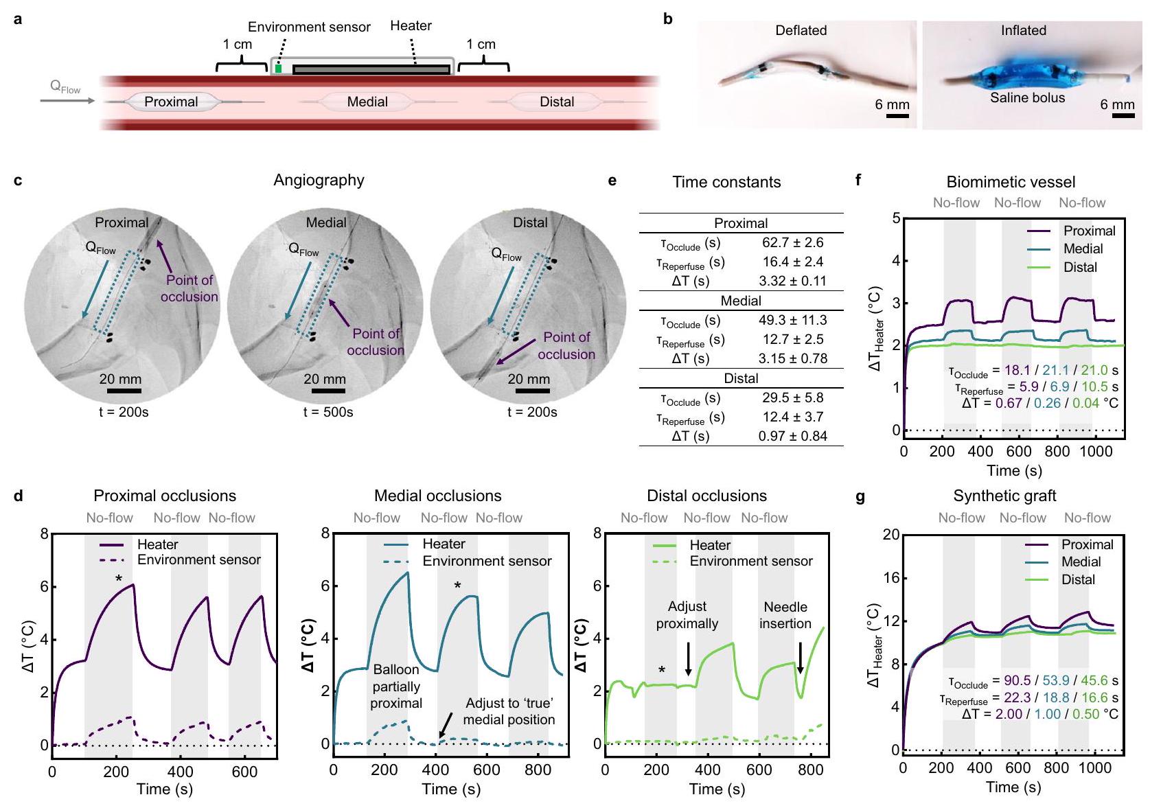 sensor as unobstructed blood movement upstream cools the sensor. Repositioning to a medial from a slightly proximal position during the second cycle repeat better demonstrated this phenomenon. Distal occlusions are less apparent which we attribute to residual flow through collateral circulation. Minimal position adjustments reflect variable contributions of branched arteries to local perfusion, as shown by altered response profiles during each distal occlusion event. Overall, we observe a trend of decreasing time constants for occlusions ( ) and heater as the site of stenosis transitions from a proximal to a distal position (Fig. 6e). Control measurements on an unobstructed neighboring vessel show no long-range dependence (Supplementary Fig. 33).