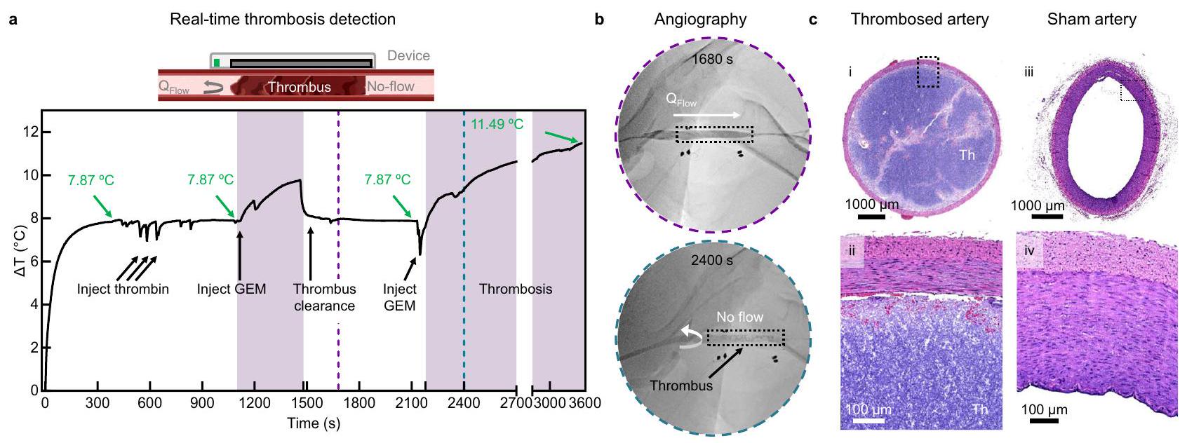 A final demonstration of our device capabilities is the real-time detection of thrombosis, which is the most common and unpredictable mode of VA failure in patients receiving dialysis (Fig. 7). We induce an acute vascular occlusion within a segment of the femoral artery using a minimally invasive catheter-directed endovascular approach. Initial injections with thrombin are unsuccessful in generating a thrombus, likely due to anticoagulative heparin circulating in the bloodstream. Subsequent injection of gel embolic material (GEM, Obsidio ) vessel induces clot formation in the artery (Supplementary Fig. 36). Following equilibration ( 300 s ), the device we detects injection, thrombosis, and reperfusion events (Fig. 7a). We note that heater signal accurately rebounds to pre-embolization flow temperatures upon removal of the embolic material using a suction catheter. Reinjection of GEM generates a full thrombus and rapid increase in heater signal. Associated angiograms at 1680 s and 2400 s document the initial unobstructed (patent-flow) and later obstructed (no-flow) vascular site, respectively (Fig. 7b and Supplementary Movie 2-3).