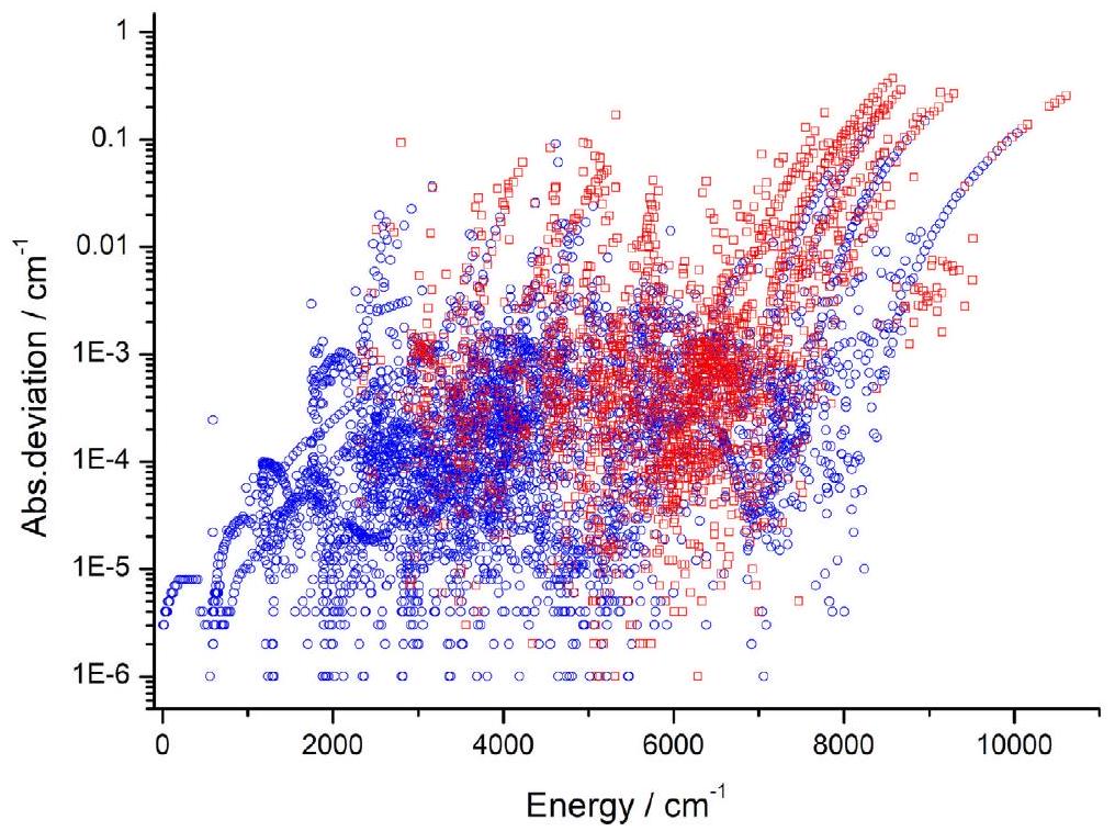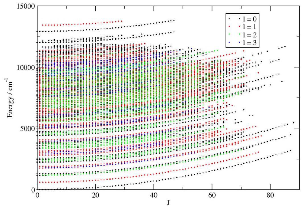 عدد الانتقالات التي تم قياسها مرة واحدة هو 27444، بينما هناك 4 و142 انتقالات تم قياسها 7 و6 مرات، على التوالي (عدد مستويات الطاقة الروفيبرational التجريبية المحددة، 17561، أقرب بكثير إلى 43000 من 68000).