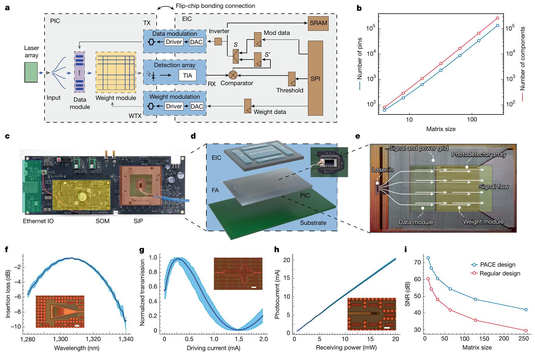 لتنفيذ النظام الذي يمكنه تحقيق الأداء المستهدف باستخدام الخوارزمية التكرارية الاستدلالية الموصوفة أعلاه، هناك حاجة إلى دوائر ضوئية كبيرة الحجم يمكنها دعم حجم مصفوفة كبير بشكل ملحوظ، مع التحديات المتعلقة بعامل الشكل العالي للتكامل وأداء الجهاز المتسق. الشكل 2 يظهر التكامل العالي.محرك حسابات الحساب الضوئي (PACE) الذي طورناه في هذا العمل. كما هو موضح في الهيكل المعماري في الشكل 2أ، تم بناء هذا النظام لتنفيذ الخوارزمية التكرارية الاستدلالية الموضحة في القسم السابق بكفاءة. تم اختيار هيكل هجين مع دائرة متكاملة ضوئية (PIC) ودائرة متكاملة إلكترونية (EIC) مدمجة في نظام في حزمة (SiP)، حيثالبيانات البصرية وتنفذ وحدات الوزن عملية oMAC. تتعامل الدوائر التناظرية والرقمية المجاورة في EIC مع التحكم والمنطق التكراري. يتم تبادل الإشارات من خلال تحويل كهربائي إلى بصري عالي السرعة. التحويل بواسطة المودولات الضوئية والتحويل من الضوء إلى الكهرباء بواسطة كاشفات الضوء. تتولى الدوائر الرقمية في وحدة التحكم الإلكترونية معالجة إدخال البيانات، وقراءة البيانات، والعمليات المنطقية، بالإضافة إلى الساعة والتحكم. تم تصميم ذاكرة الوصول العشوائي الثابتة المدمجة (SRAM) لإدارة تخزين البيانات. المتجه الأولي، في إشارة إلى في الشكل 1ب، يتم حقن بيانات الوزن في محركات المتجهات ومحركات الوزن المقابلة من واجهة الأجهزة التسلسلية (SPI) لدفع معدلات المتجهات والأوزان. يتم إرسال قيم العتبة المحددة مسبقًا إلى المقارنات. ثم يبدأ النظام الدورات التكرارية. في تكرار مستقل، يتم إرسال نتائج المتجه المعالجة عبر القنوات الضوئية إلى المقارنات لتوليد متجه حالة جديد.، في إشارة إلى في الشكل 1ب. يتم تخزين المتجه الجديد والقيمة الذاتية المقابلة في SRAM بالإضافة إلى إعادته كمتجه ابتدائي لإعادة تشغيل معدلات المتجه في التكرار التالي. يتم إجراء ما مجموعه 5000 تكرار لضمان تقارب الحلول (انظر الطرق والبيانات الموسعة الشكل 1). لإقامة نظام oMAC بحجم مصفوفة أكبر من 64، يتطلب الأمر أكثر من 10,000 مكون بصري وأكثر من 10,000 دبوس لتوجيه الإشارات، كما هو موضح في الشكل 2b. وبالتالي، هناك حاجة إلى تكامل عالٍ مع تعبئة متقدمة. شكل تقليدي مع